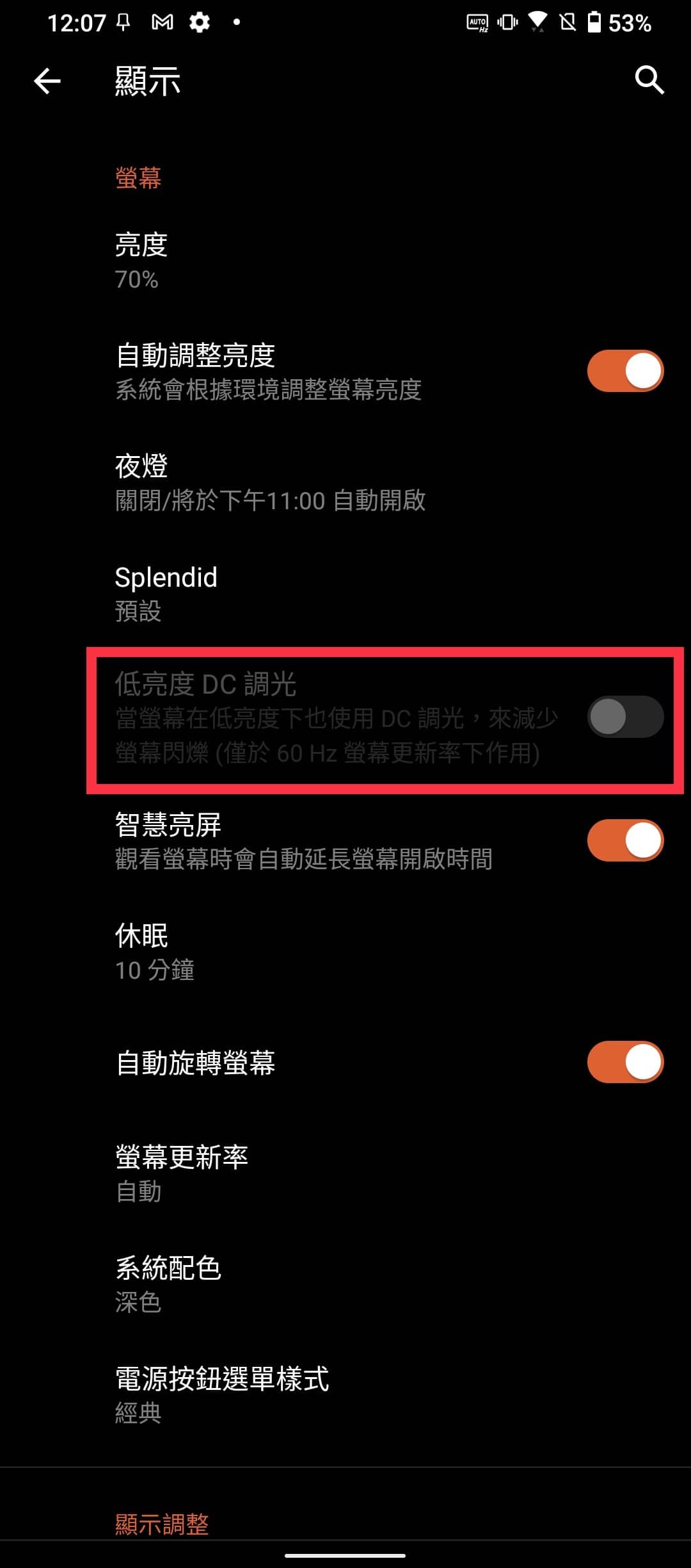 ▲ 5s Pro 的 AMOLED 螢幕在低亮度下使用的是 PWM 調光,部分使用者長時間觀看 PWM 螢幕會出現眼睛不適的狀況,因此它也內建「低亮度 DC 調光」的功能,不過這項功能僅限螢幕更新率為 60 Hz 時開啟。