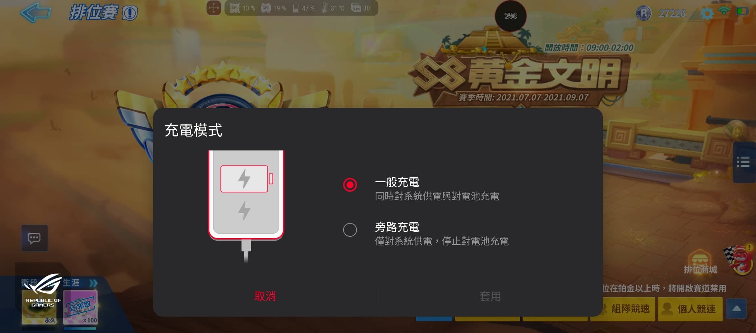 ▲ 如果你擔心玩遊戲耗電太快,又不希望充電加速手機發熱或影響電池壽命,可以在「遊戲精靈」把充電模式切換成「旁路充電」,如此一來就只會對系統供電,而非電池,避免充電發熱的問題。