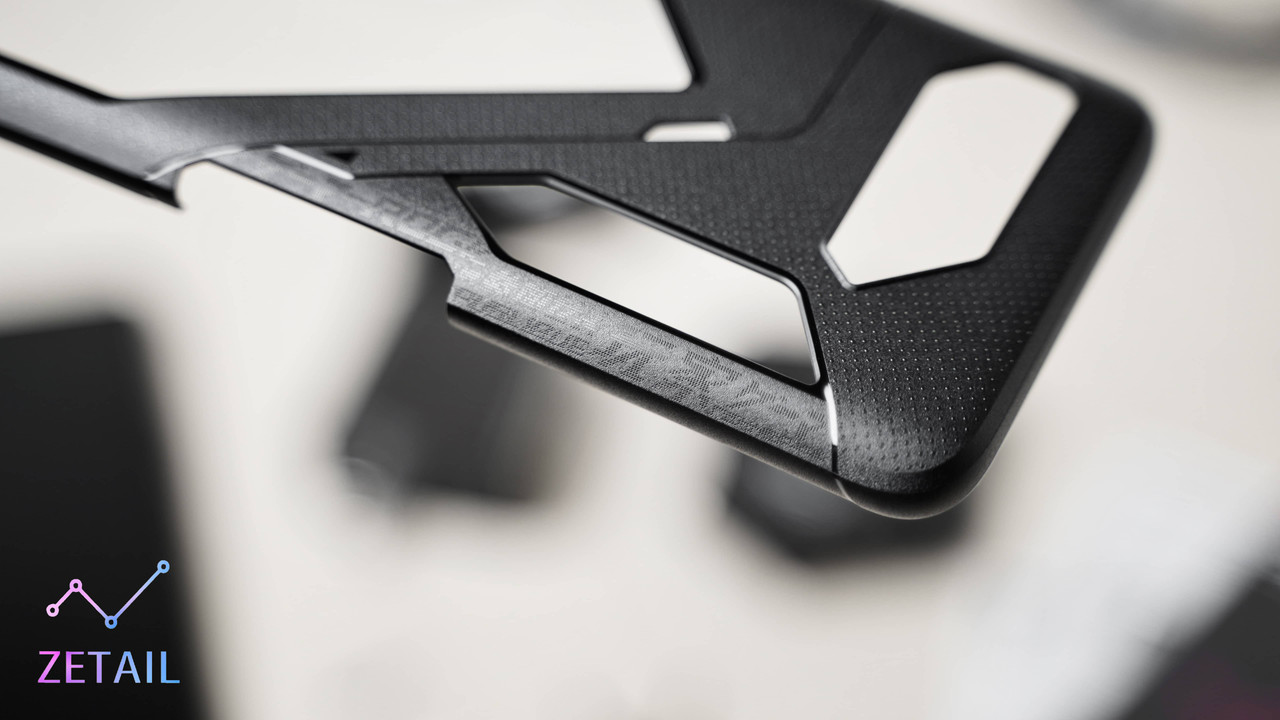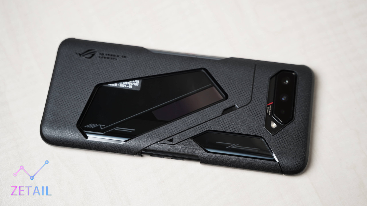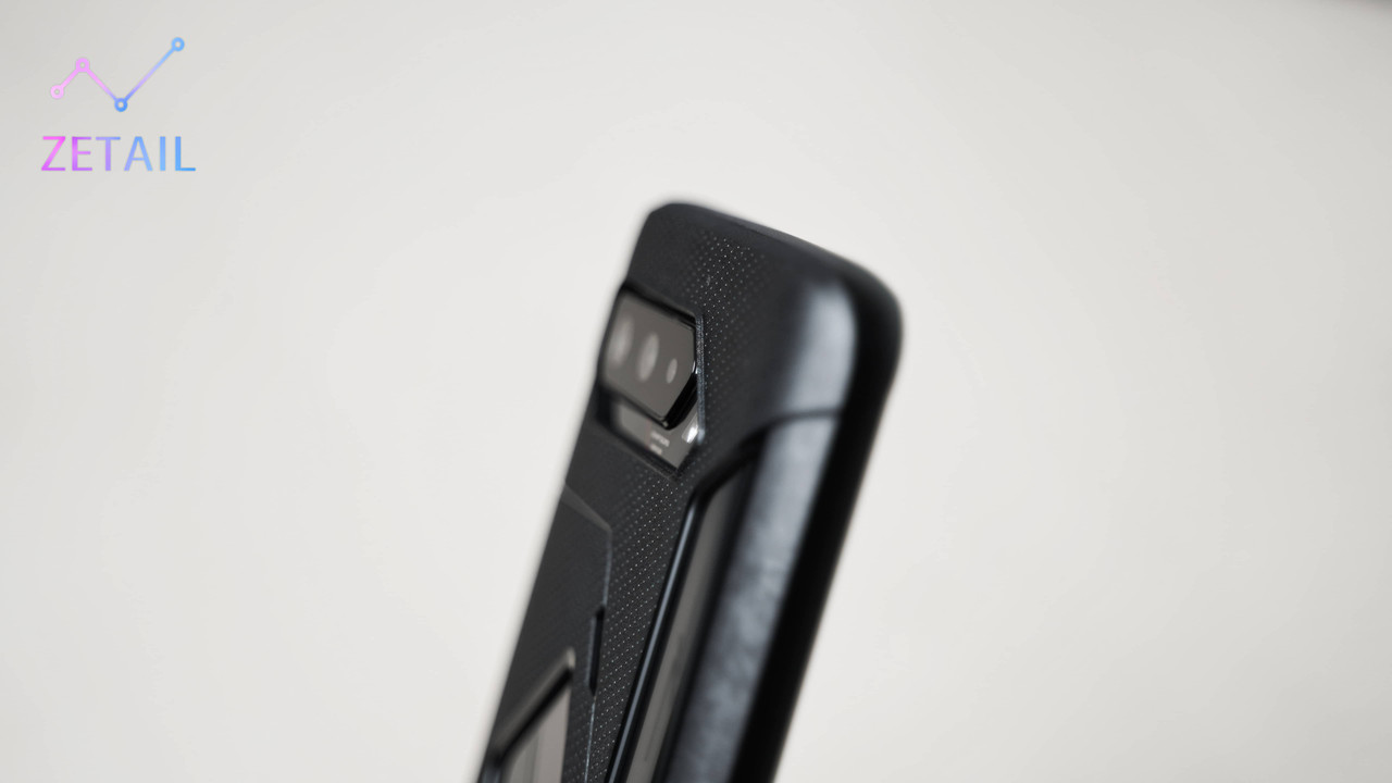 有在關注 ROG Phone 系列的消費者,應該會注意到機身背面的散熱開孔面積一代比一代小,到了今年的 ROG Phone 5s Pro 甚至是完全拿掉了,可能是對散熱表現的提升感到自信,又或是為了降低生產難度、提高產品良率,雖然我覺得把如此有辨識度的設計取消很可惜,但往好處想,這樣也代表 5s Pro 有著更好的結構強度、機身一體性與密封性。