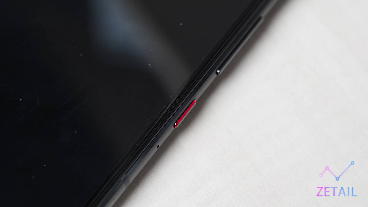 ▲ 電源鍵邊框和 SIM 卡槽的裝飾色都改成了亮眼的紅色。另外,SIM 卡槽上有「GLHF!」的字樣,在遊戲中是「Good Luck, Have Fun!」(祝你好運,玩得開心)的意思,趣味性十足。