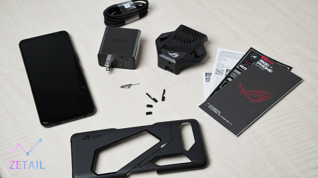 ▲ 盒裝內所有內容物如上圖,包括 ROG Phone 5s Pro、Aero 專屬保護殼、ROG 特殊造型卡針、四組防塵塞、HyperCharge 充電器、USB-C 充電傳輸線(C2C)、「空氣動力風扇 5」、使用說明書、ROG 貼紙…等。