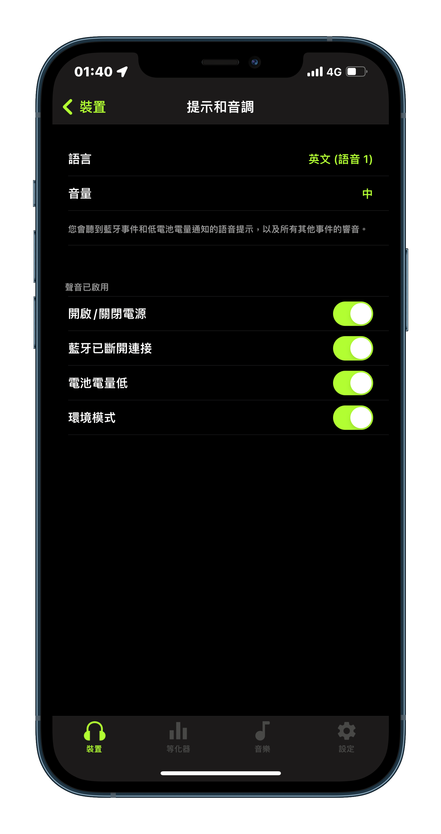 ▲ 在「提示與音調」功能,除了可以設定提示音的語言、音量,還能開關耳機發出提示音的時機。