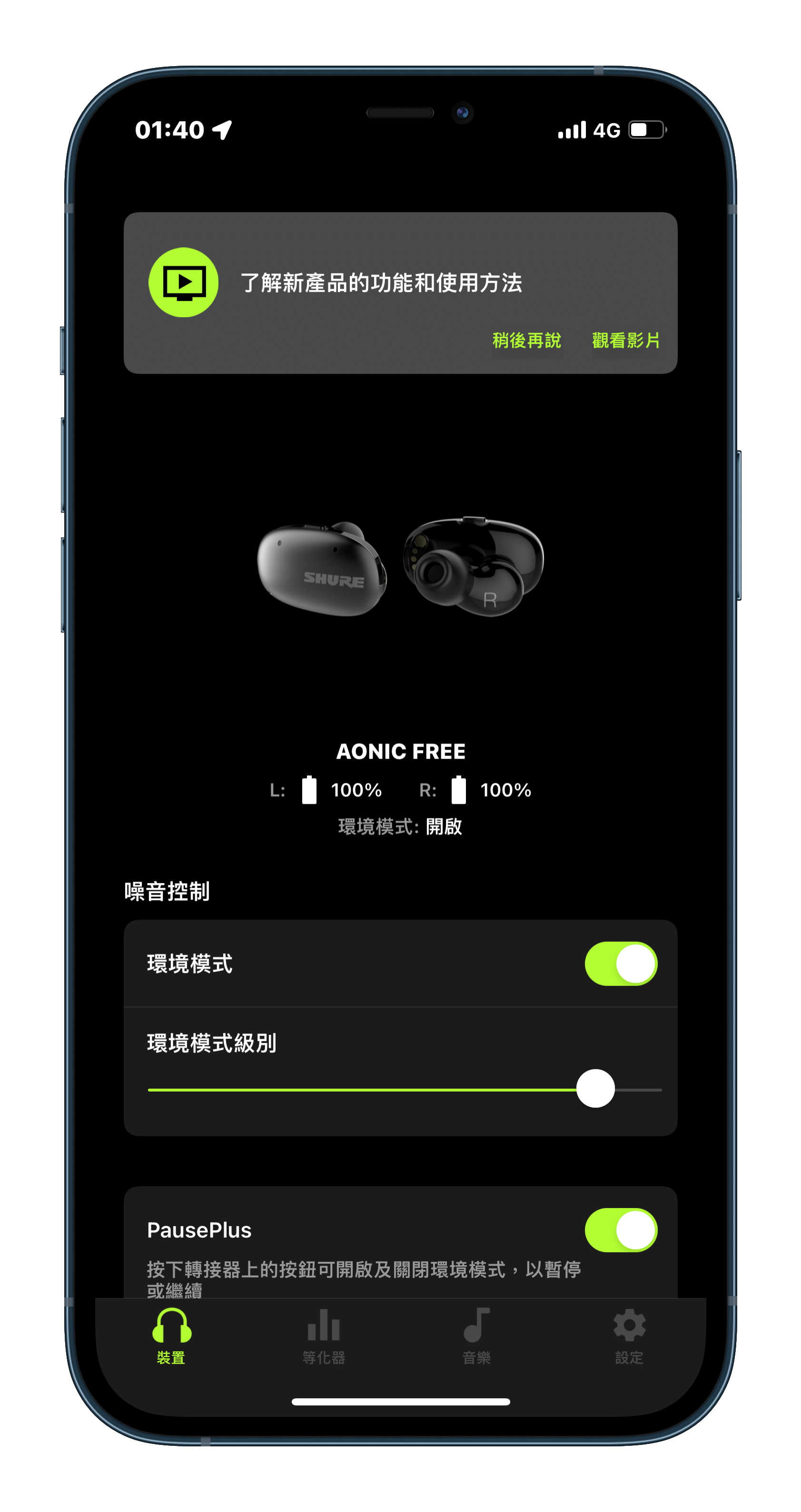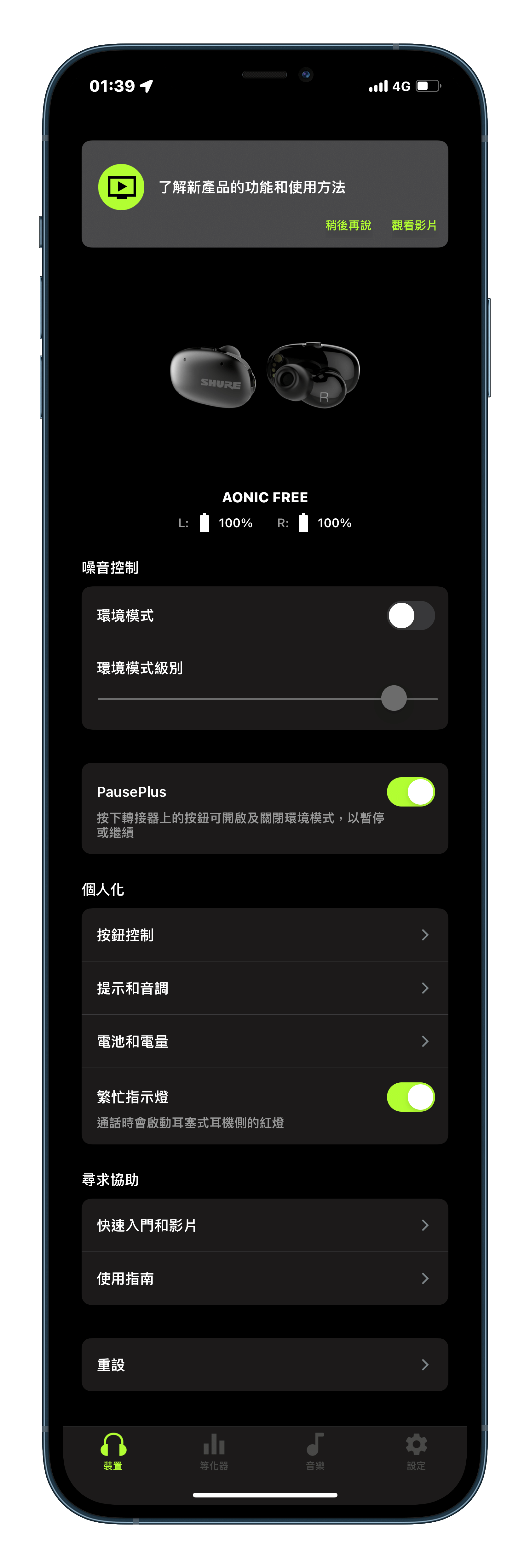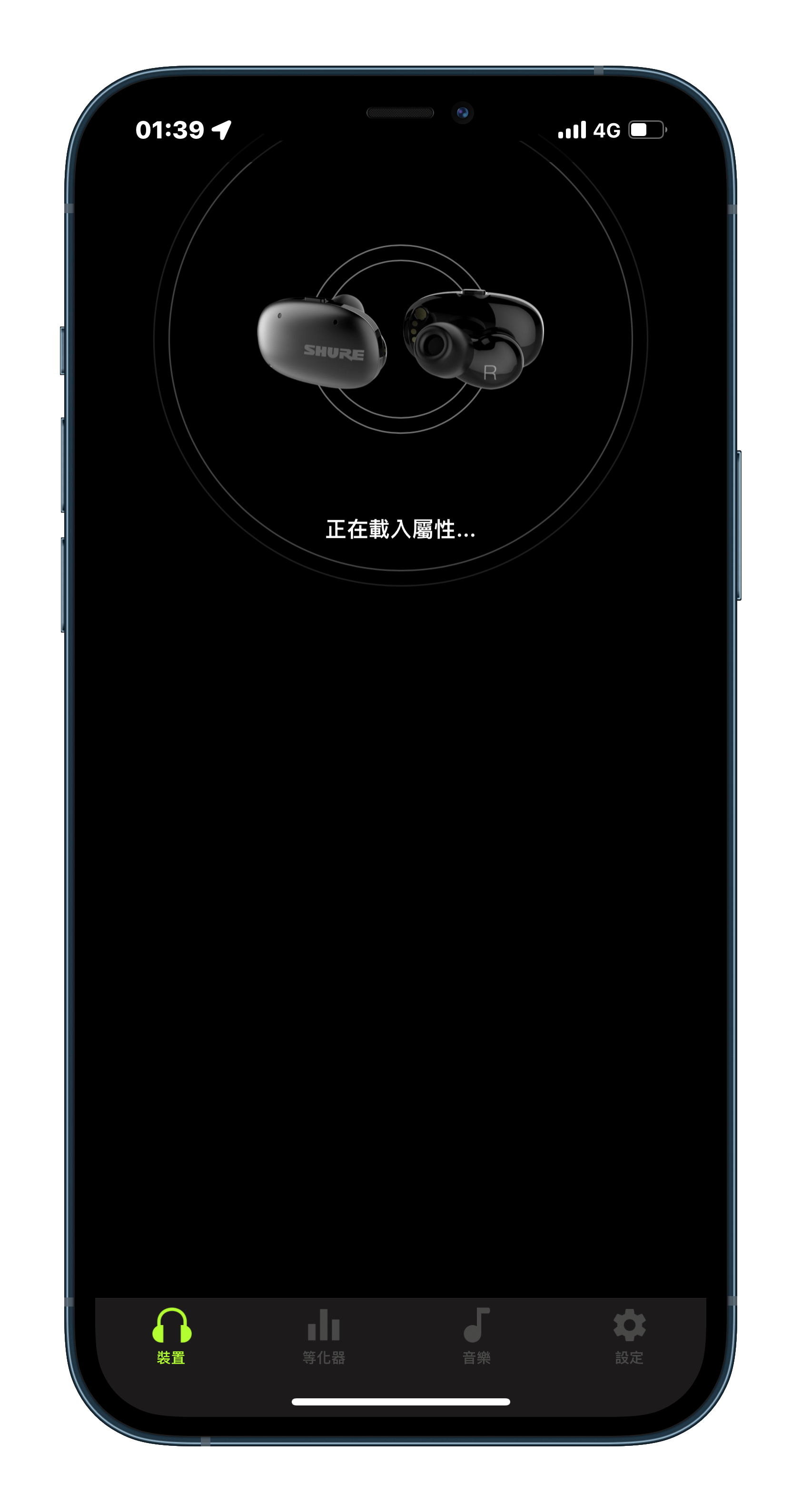 ▲ 跟 AONIC FREE 完成藍牙配對之後,打開「ShurePlus PLAY」應用程式就會自動跟耳機連線,這個程序的速度如果可以再快一點會更好。