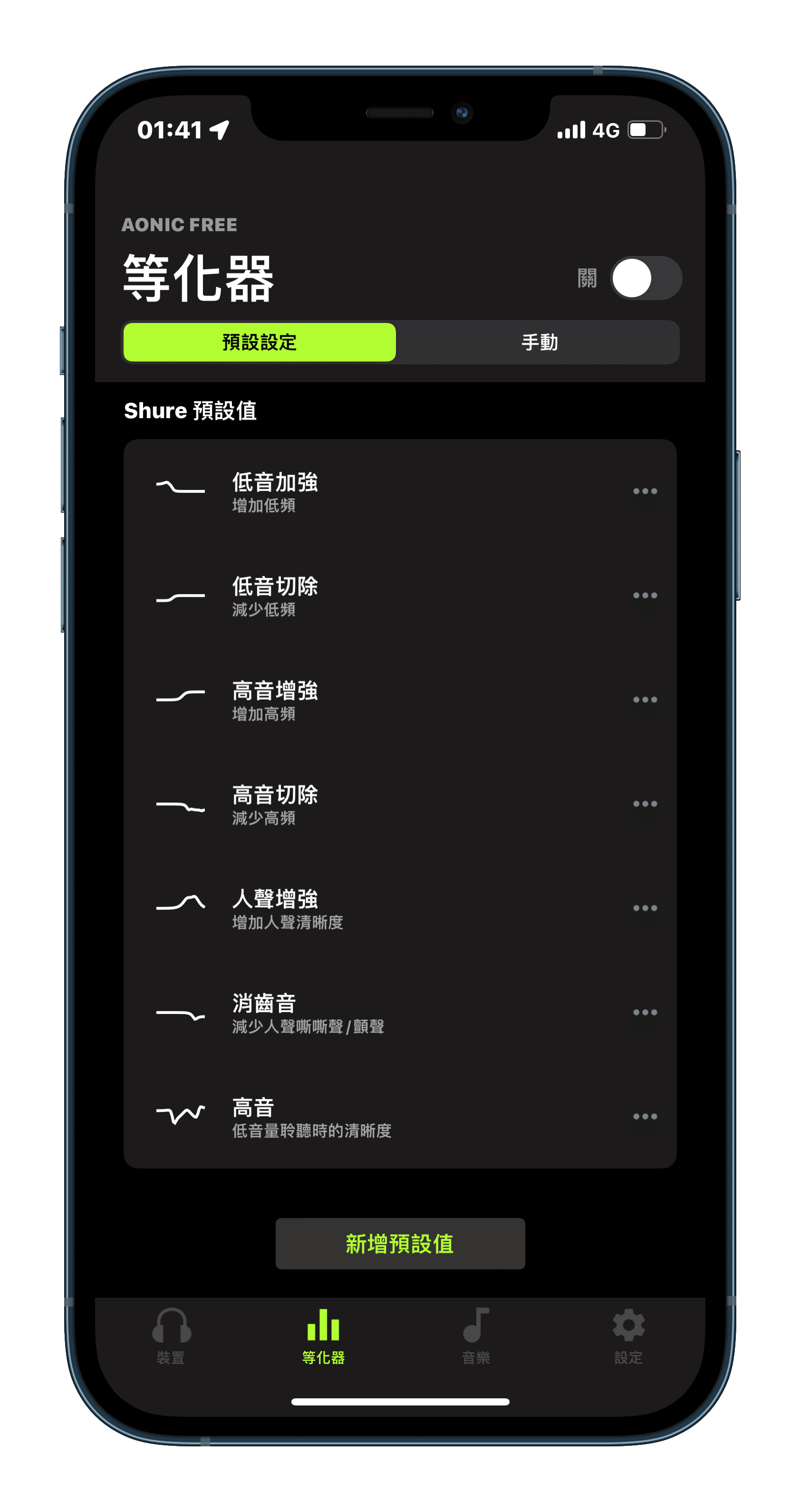 ▲ 切換至「等化器」頁面,首先會看到 7 種預設的 EQ 等化器,適合想要選擇現成 EQ 的使用者。