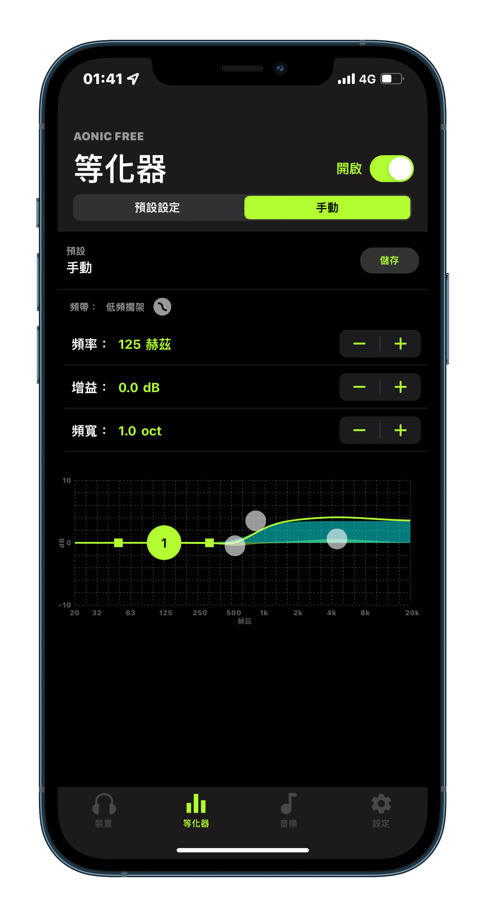 ▲ 如果你喜歡自己手動調整,點選「手動」後會看到上圖的介面,在選擇特定的「頻率」之後,你可以對它調整「增益」和「頻寬」,調整自由度很大。值得一提的是,你調整的等化器會儲存在耳機裡,即使換了手機、換成別人用,等化器依然會跟著耳機走。
