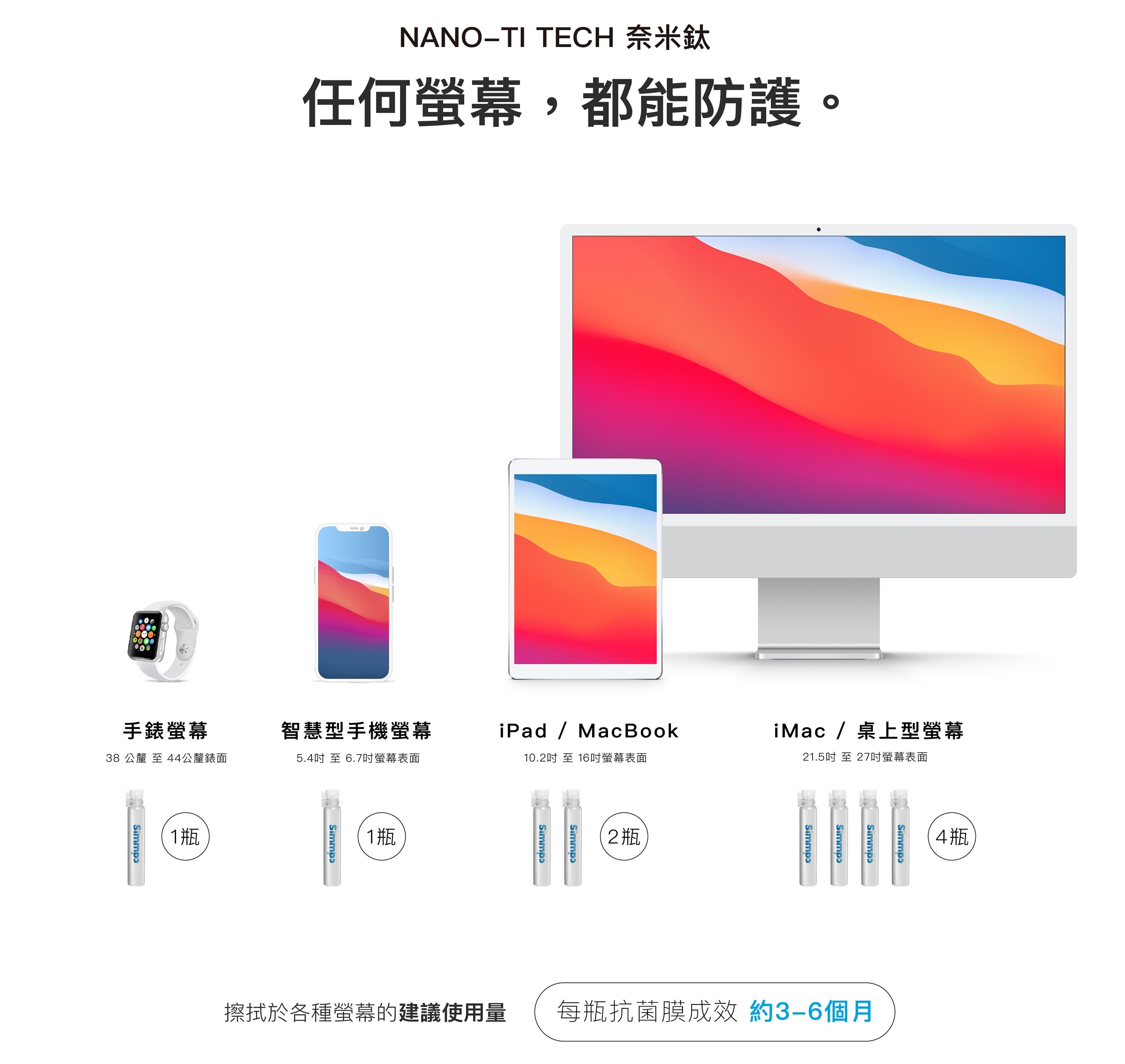 Simmpo 液態螢幕抗菌膜其實不僅能塗在手機螢幕上,如果你想幫平板電腦或筆記型電腦鍍膜也沒問題,但畢竟每一瓶抗菌膜都只有 2 毫升(ml)左右,如果螢幕尺寸太大,一瓶可能會不夠。關於這點,Simmpo 貼心地在官網提供了各種尺寸裝置相對應需要幾瓶抗菌膜的資訊,小如智慧型手錶、手機就只需要一瓶;大如 iMac 或顯示器則可能要用到四瓶,建議你在選購前先參考看看。