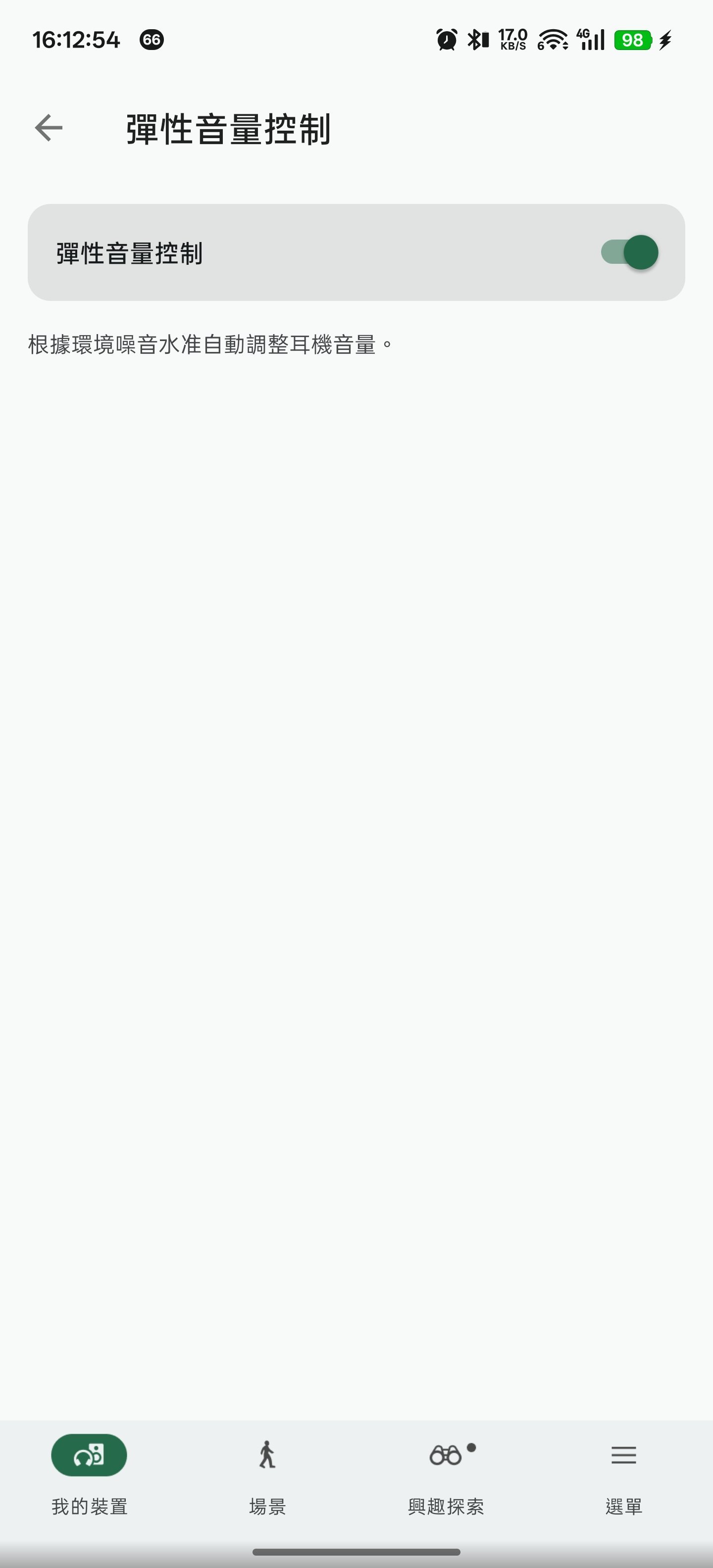 ▲ 將 LinkBuds Clip 更新到最新版之後,就可以在 app 裡面看到「彈性音量控制」的功能。目前只有開關,或許未來會有更細部的功能設定也不一定。