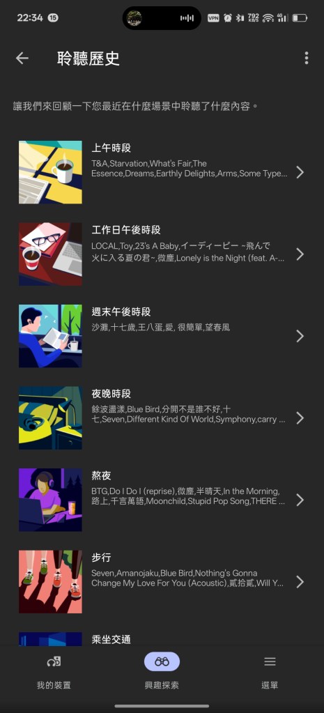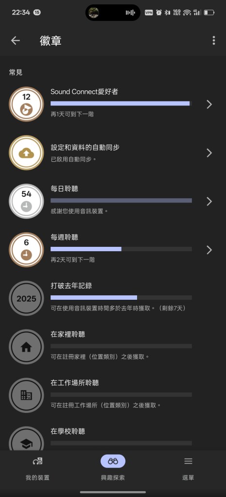 ▲ 在底部中間的「興趣探索」頁面,可以看到你在不同時段特別喜歡聽哪些音樂;透過持續使用 WF-C710N,你也可以解鎖各種徽章;日誌則可以讓你看到自己的耳機使用時間。要強調的是,這些功能都必須讓 App 在背景執行,如果使用耳機的時候,App 不在後台,那就沒辦法記錄。