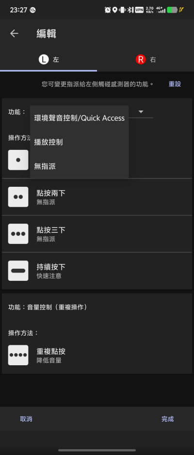 ▲ 在 App 中,雖然乍看可以自訂耳機的操作功能,但實際上,Sony 已經幫你準備好兩套操作功能,你只能分別選擇左、右邊耳機要套用哪一套設定,而不能具體自訂點一下、點兩下耳機要觸發的功能。