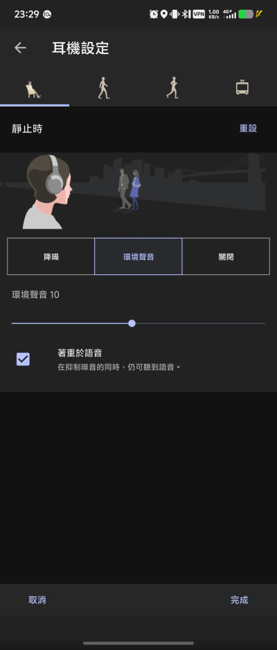 ▲ 當然,你也可以自行設定在靜止、走路、運動、通勤過程中偏好的降噪模式與強度。