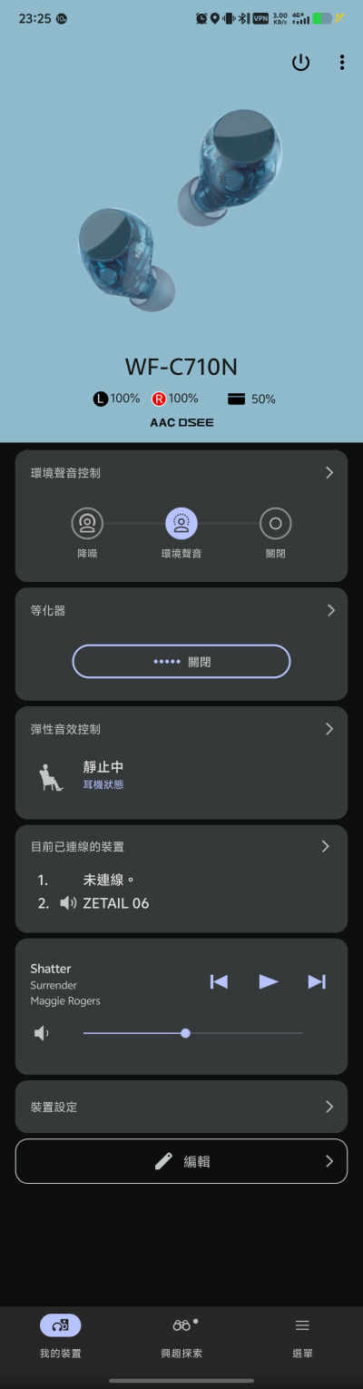 除此之外,WF-C710N 還支援搭配「Sound Connect」App 使用。如果你有印象,Sony 之前的耳機 App 叫作「Headphones Connect」,我曾說過它的美觀性、易用性、穩定性都有待提升,所以我滿心期待這次改版的結果。沒想到這只是一次「拉皮」,雖然有了更實用的新首頁(也確實好看很多),但只要點進任一功能,又會回到舊版介面。整體操作邏輯也未見明顯改變,實在不算好用。還是希望 Sony 能下定決心好好整頓一番。
