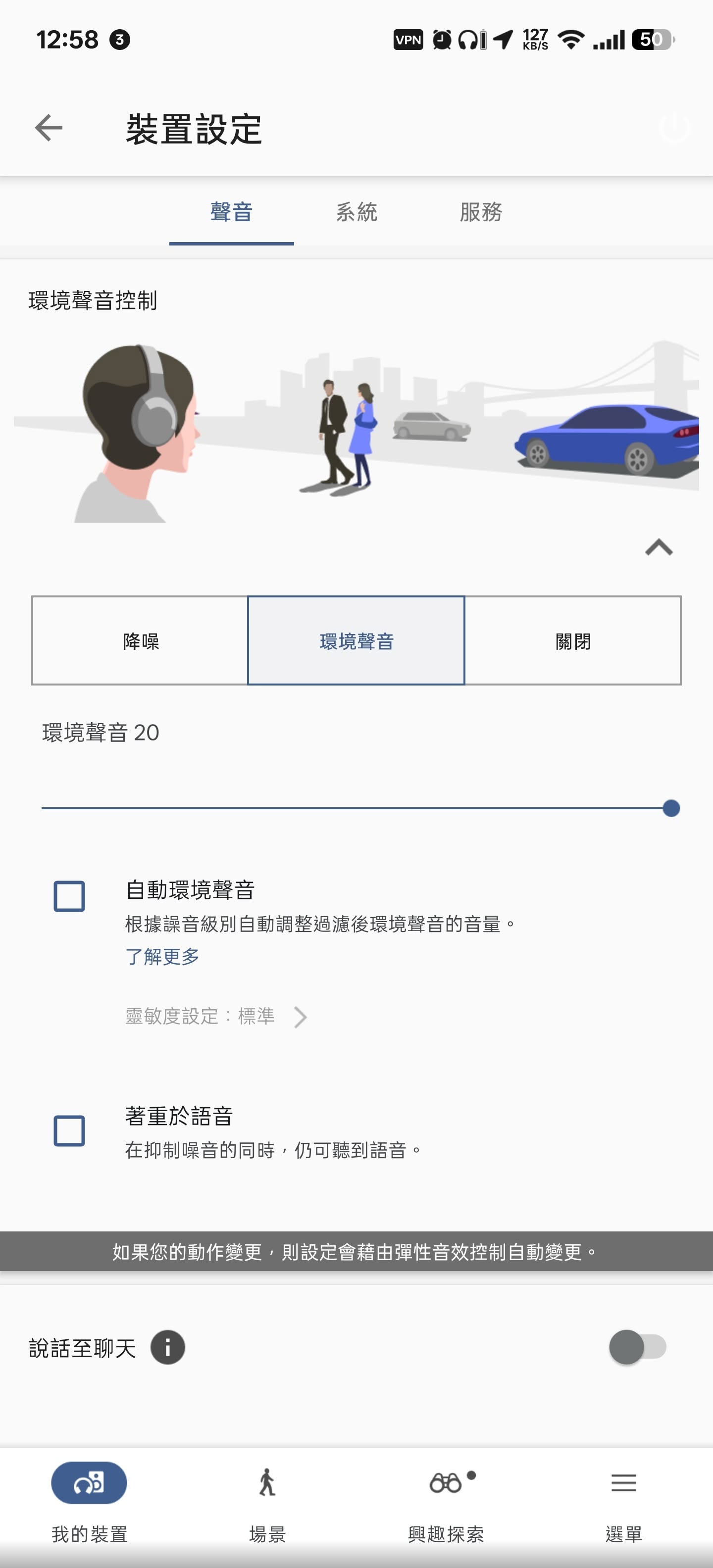 ▲ WH-1000XM6 的環境音模式共有二十段強度可以調整,你也可以打開「著重於語音」,讓它強化人聲、抑制其他聲音頻段。