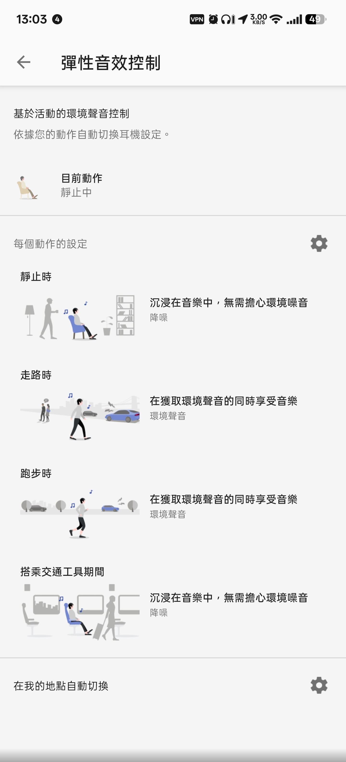 ▲ WH-1000XM6 的「彈性音效控制」功能就是可以讓耳機偵測到你處於不同環境或活動狀態時,自動切換降噪模式。