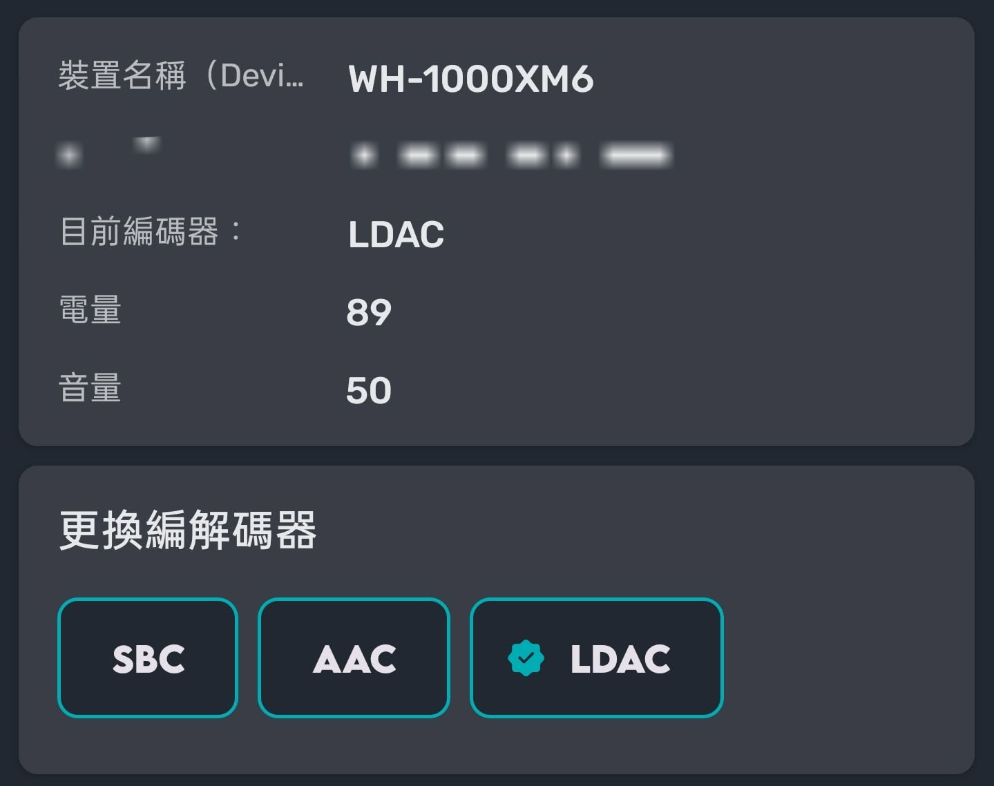 ▲ 這就是耳機連上 app 之後的新版主畫面,還挺簡潔、好看的。最上方有耳機的剩餘電量、當下使用的編碼格式。