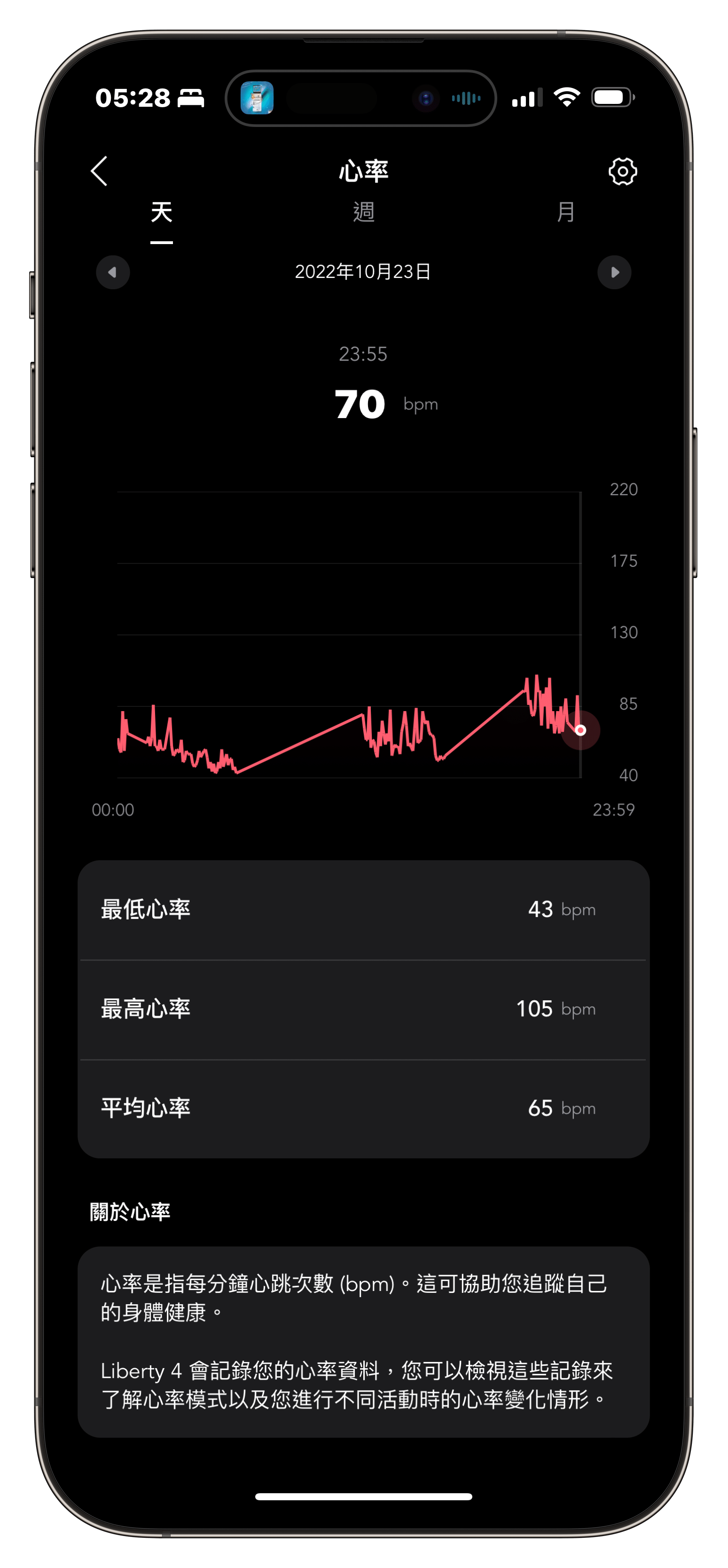 ▲ 點進「心率」,會看到當日(也可以切換當週或當月)的心率變化折線圖,下方也提供了最低心率、最高心率、平均心率等資訊。