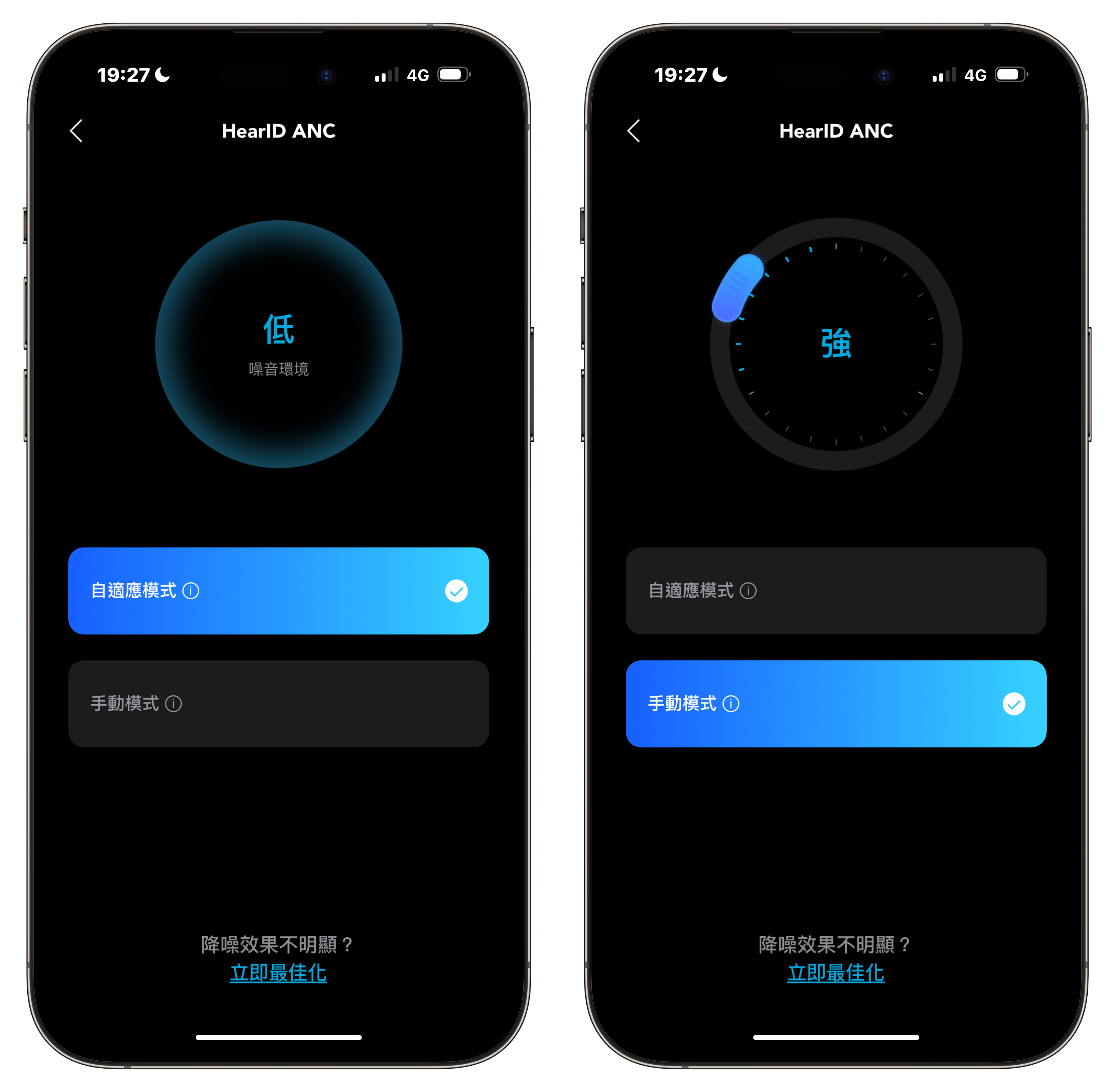 ▲ 你可以選擇「自適應模式」,讓 Liberty 4 自動調整降噪強度,或是選擇「手動」,自己調整降噪強度。
