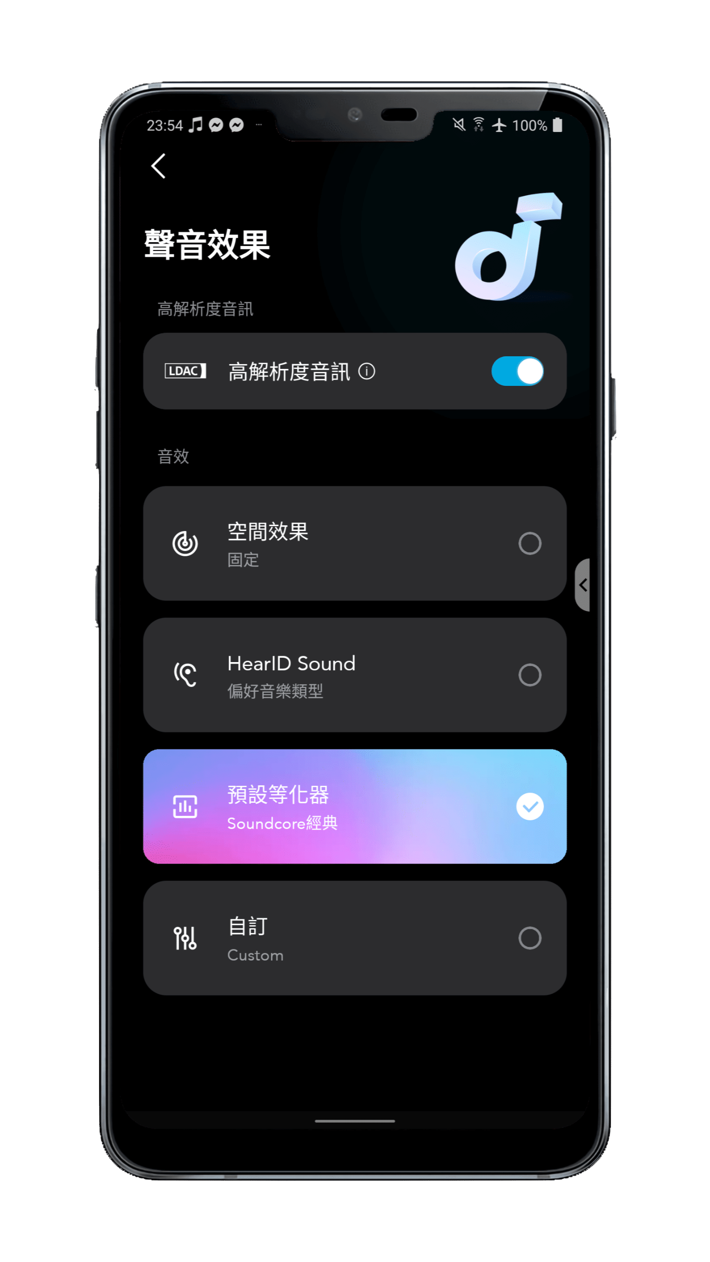 ▲ 如果你的裝置支援 LDAC,在「soundcore」應用程式會出現「高解析度音訊」的開關,打開就可以切換至 LDAC 的模式。