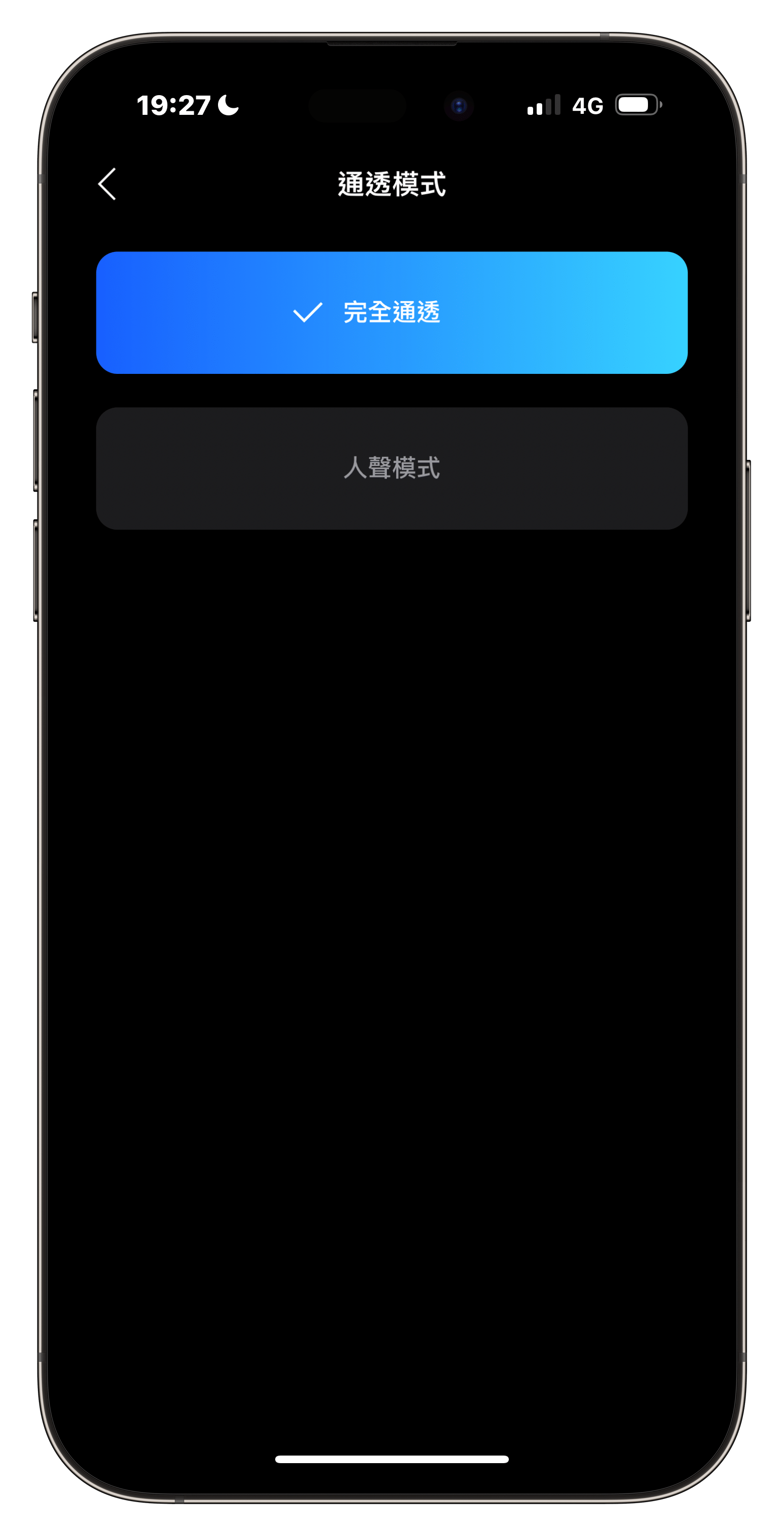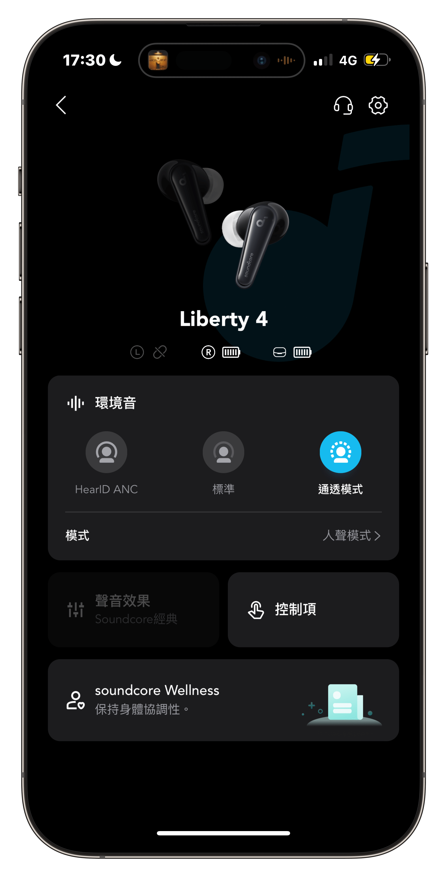 ▲ Liberty 4 的通透模式分成「完全通透」跟「人聲模式」,「人聲模式」會降低部分頻率的聲音,並強化人聲的頻段,可用性是高的,但聲音比「完全通透」悶一點。