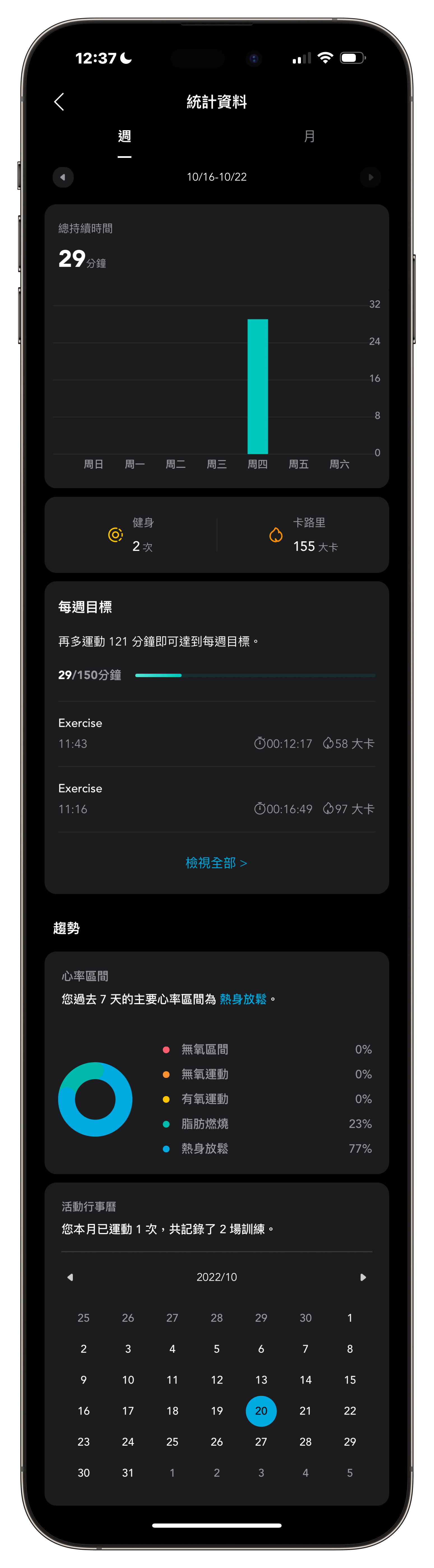 ▲ 「統計資訊」會綜合顯示你的運動記錄跟心率趨勢,讓你可以對自己的身體狀況有更整體性的了解。