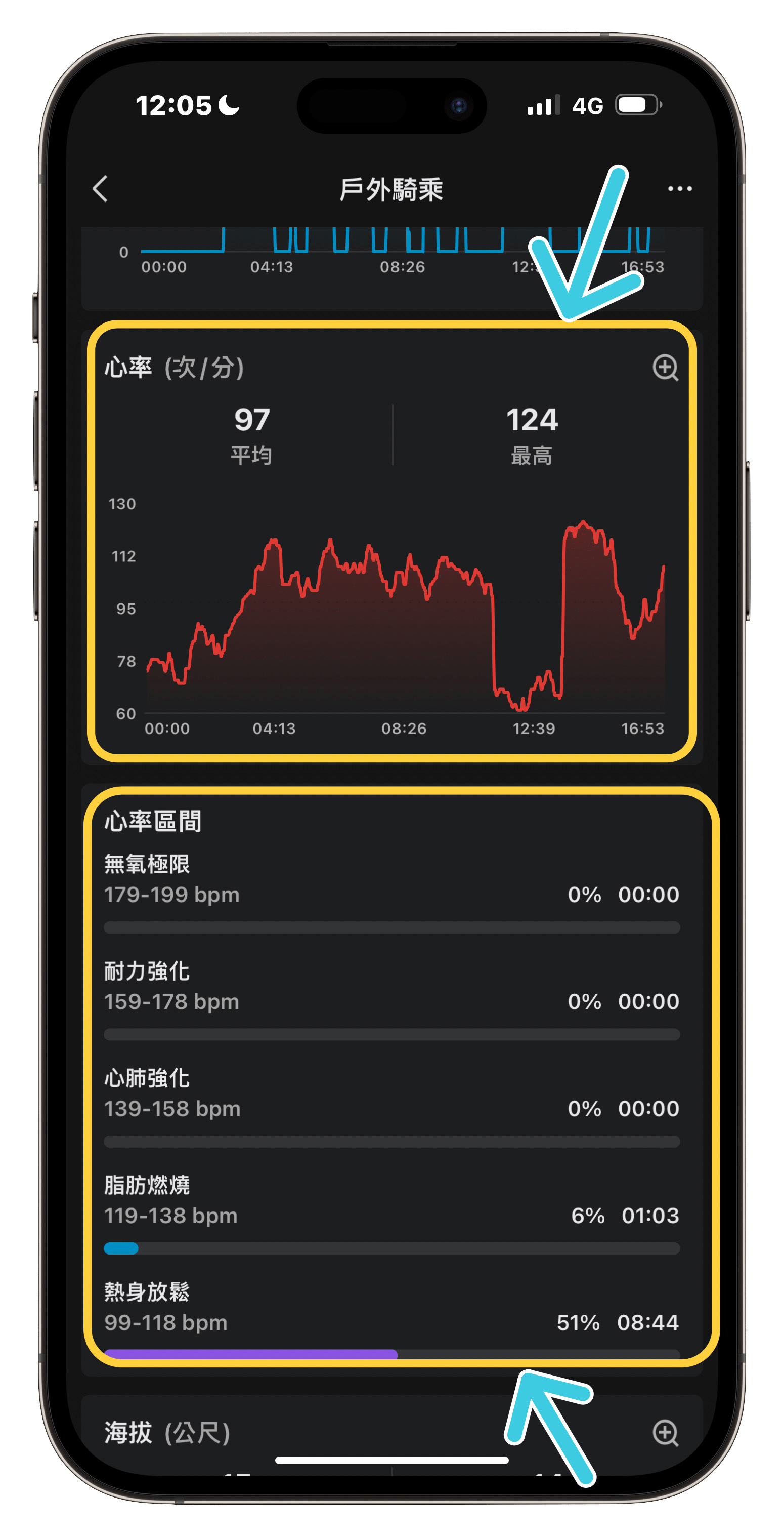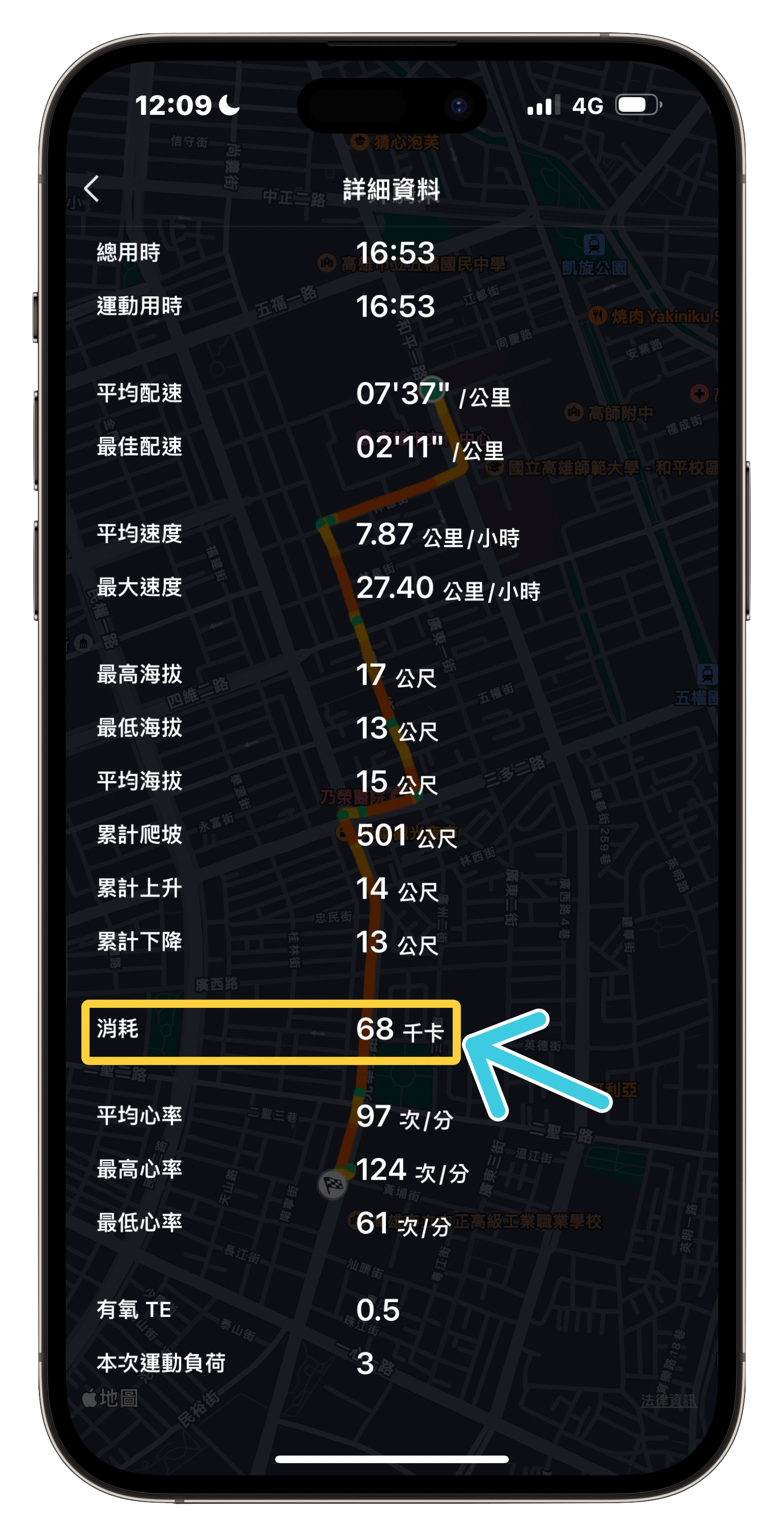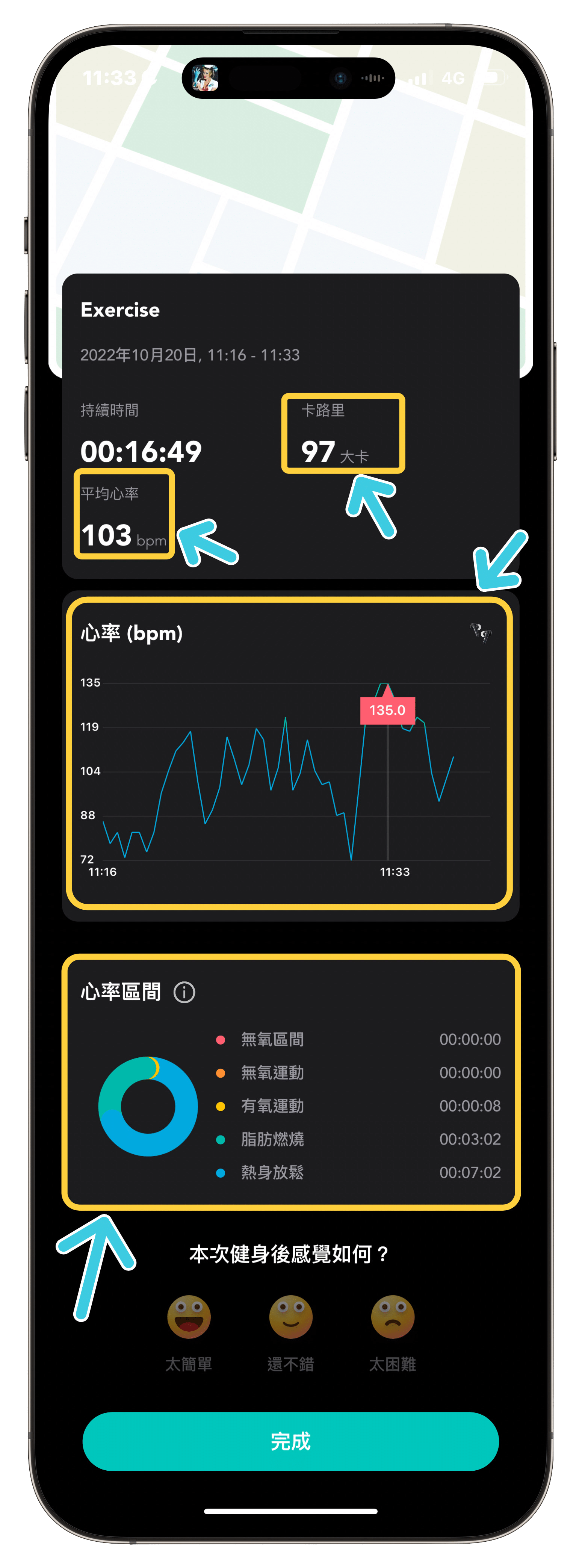 ▲ 我實際戴著 Liberty 4 騎了一趟腳踏車,得到如上圖的運動記錄(框選處是為了方便等一下比較),包括運動持續時間、預計消耗卡路里、心率資訊,都是一些基本資訊。如果可以同時用手機記錄 GPS 定位,這樣還能顯示運動軌跡,或許會更好。