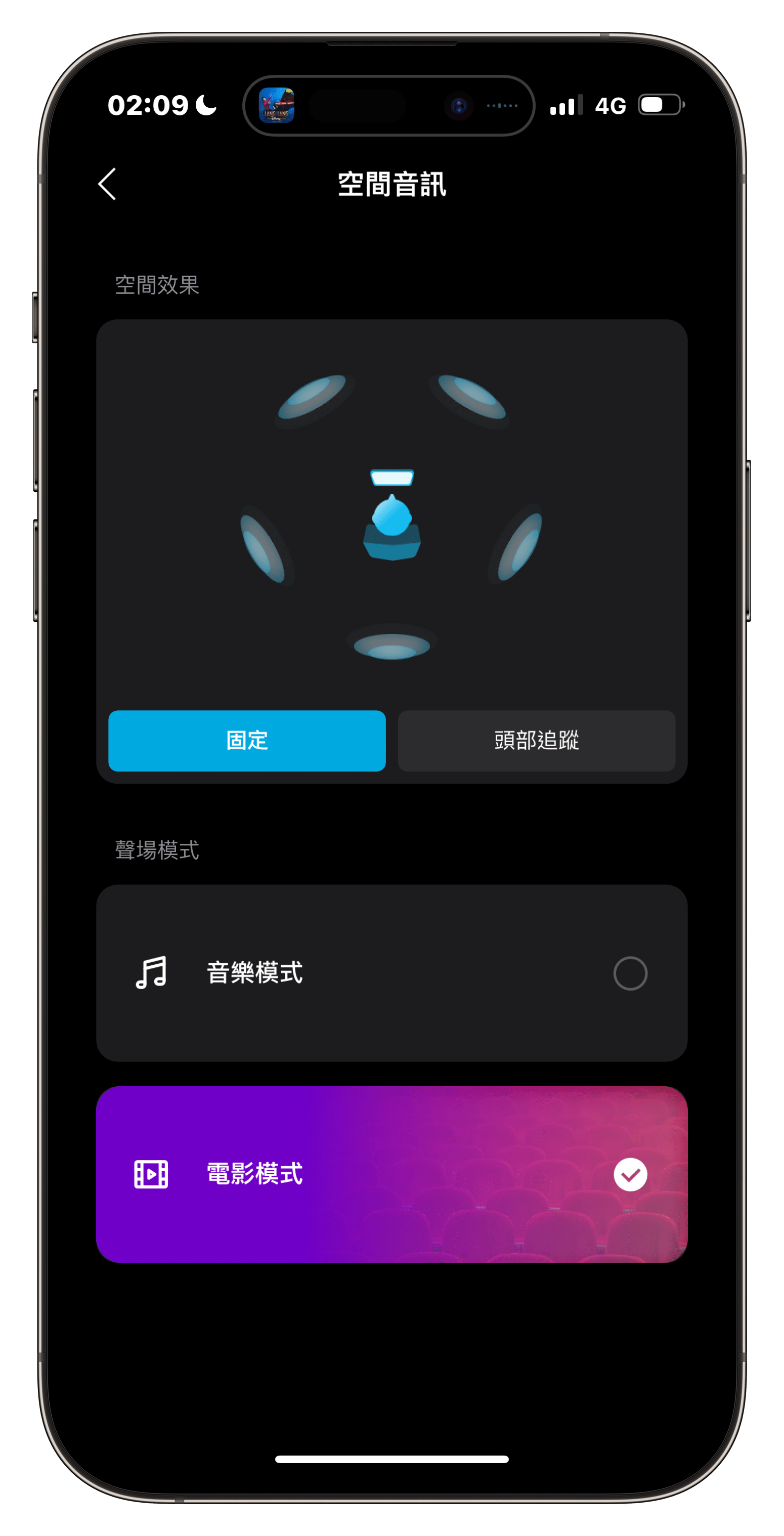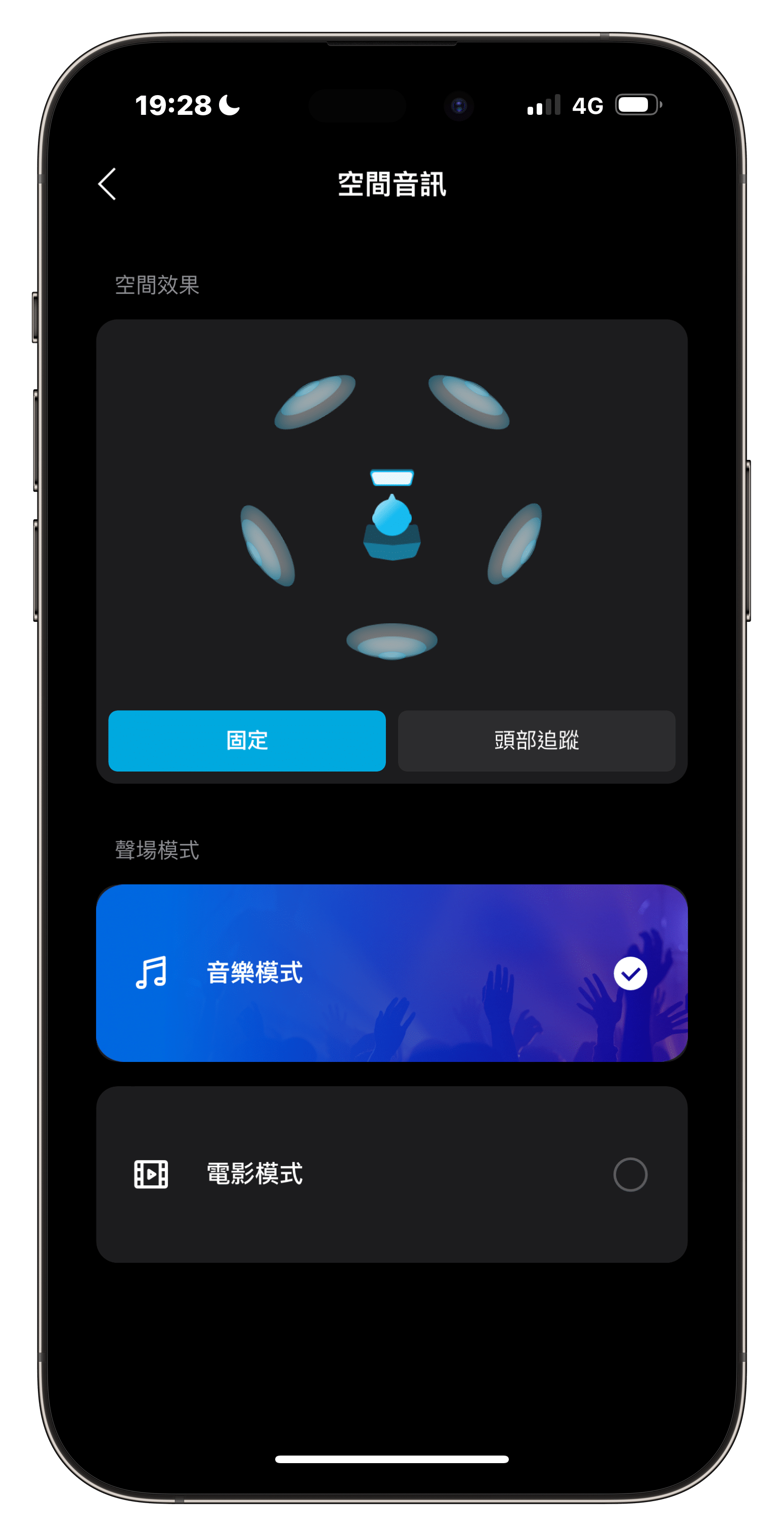 ▲ 「音樂模式」的空間音訊。還是跟蘋果的「空間化音訊」一樣,soundcore 的空間音訊也有「固定」跟「頭部追蹤」兩種形式,「頭部追蹤」指的是無論你怎麼轉頭,聲音都會固定在手機的位置,模擬聲音是直接來自手機的感覺。