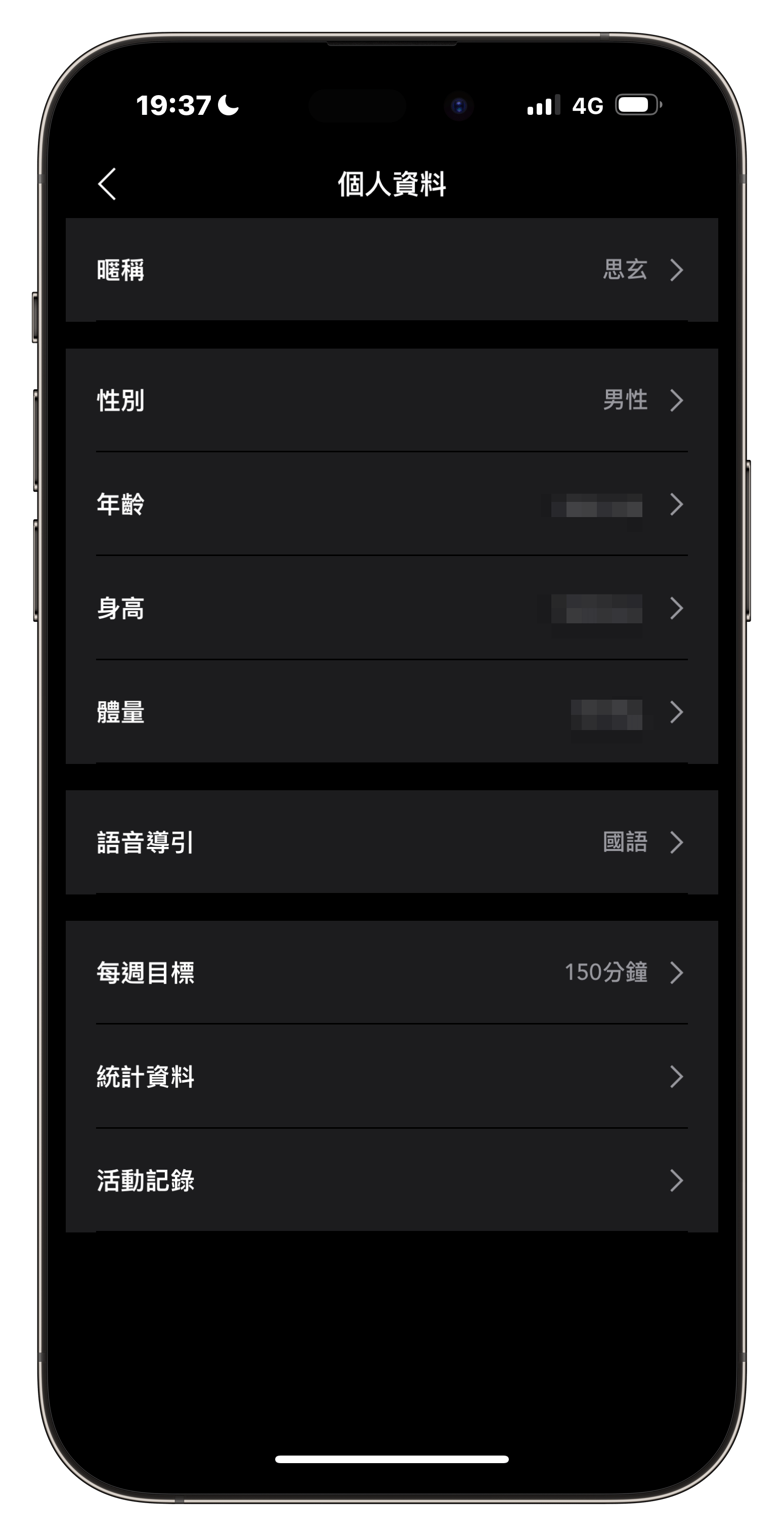 ▲ 在剛剛的主畫面點擊右上角的「個人」圖示,可以設定個人資料、更改語音導引、每週目標。