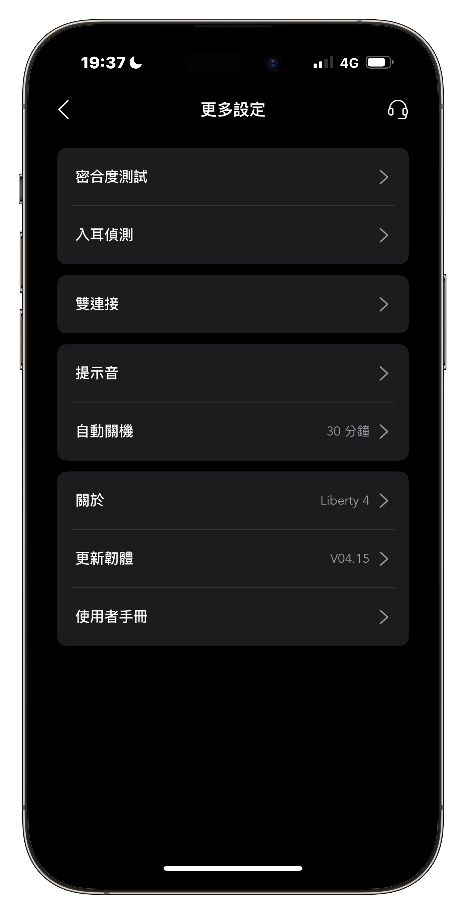 ▲ 點擊主畫面右上角的「齒輪」會進入更多設定,有耳塞密合度測試、入耳偵測調整、雙連接、更新韌體等功能的設定。