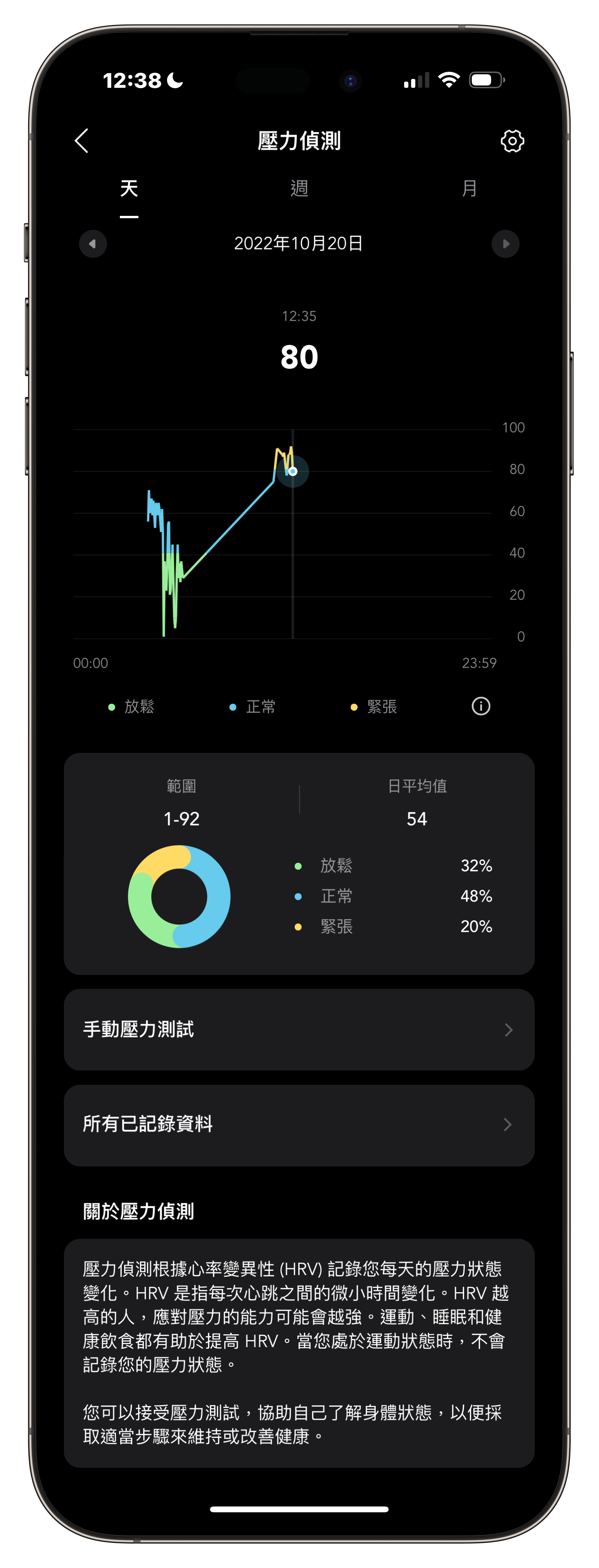 ▲ 「壓力偵測」也是類似,只是會改以圓環圖呈現綜合數據,像是日平均壓力、不同壓力階段所佔的比例等。
