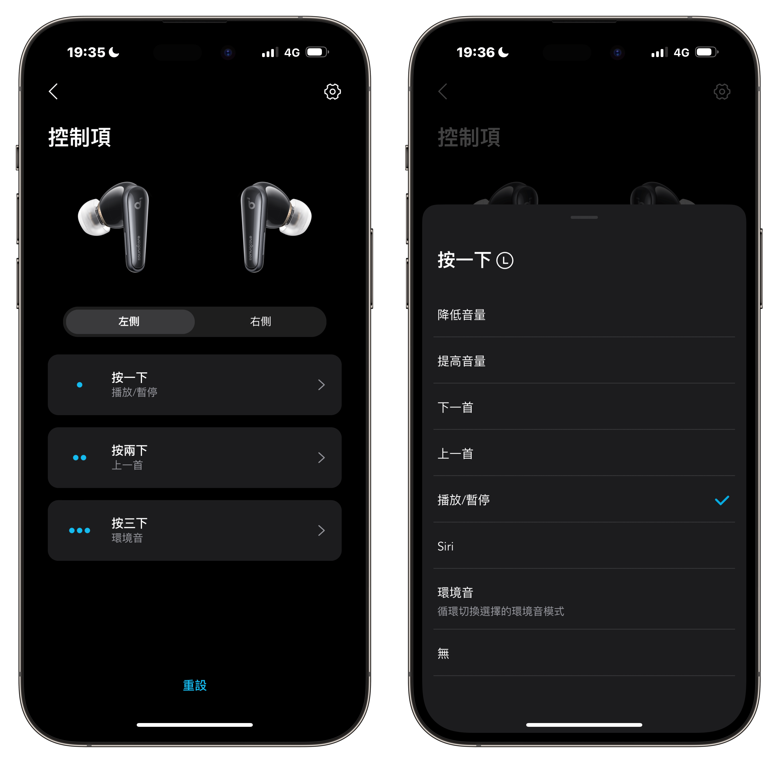 得益於長柄內的力度感應器,Liberty 4 跟 AirPods Pro 一樣,都以「用力捏」來控制耳機功能。我認為這是目前而言,最完美的真無線藍牙耳機控制方式,因為它既不像觸控會誤觸、手濕無法使用;也不像實體按鍵會破壞外觀一體性、增加損壞機會,可惜採用的耳機屈指可數。言歸正傳,Liberty 4 新的控制方式用起來可圈可點,穩定、沒有延遲、反應速度適中;唯一缺憾就是沒有開放「捏住」(捏久一點)的功能,希望未來更新有機會加入。