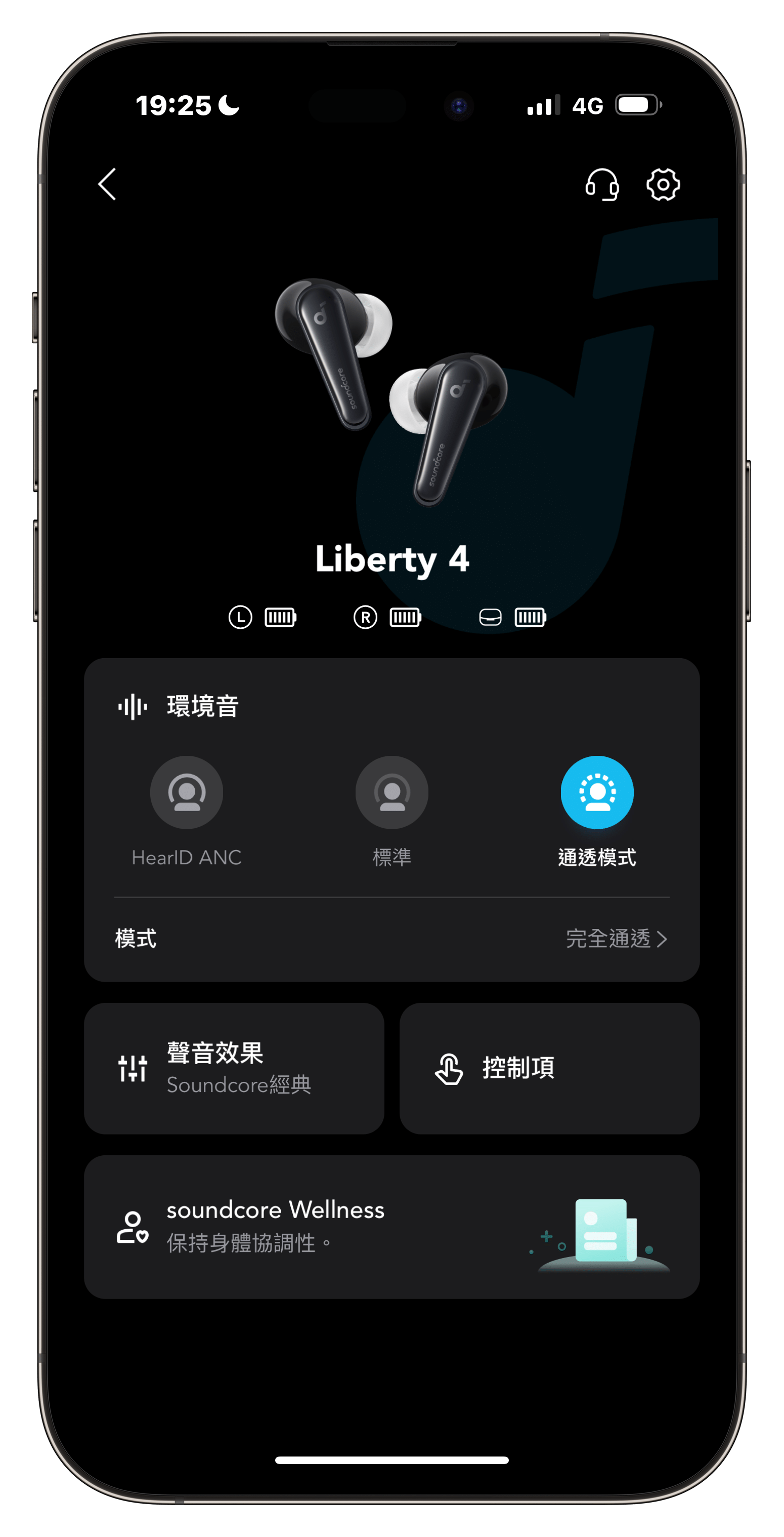 除了主動降噪,Liberty 4 當然也有「通透模式」,在這個模式下,耳機會用麥克風拾取外界的聲音,讓你雖然戴著耳機,還是能注意身旁的環境狀況,或是跟其他人互動、對話。Liberty 4 的通透模式效果有極大的進步,聲音有一點點機械感,但真的「通透」非常多,更重要的是,就連自己講話時悶悶的感覺都輕微不少,可以自然地與其他人對話,目前已經做到我可以什麼音樂都不播,就這樣開著通透模式,一直戴著耳機的程度了。