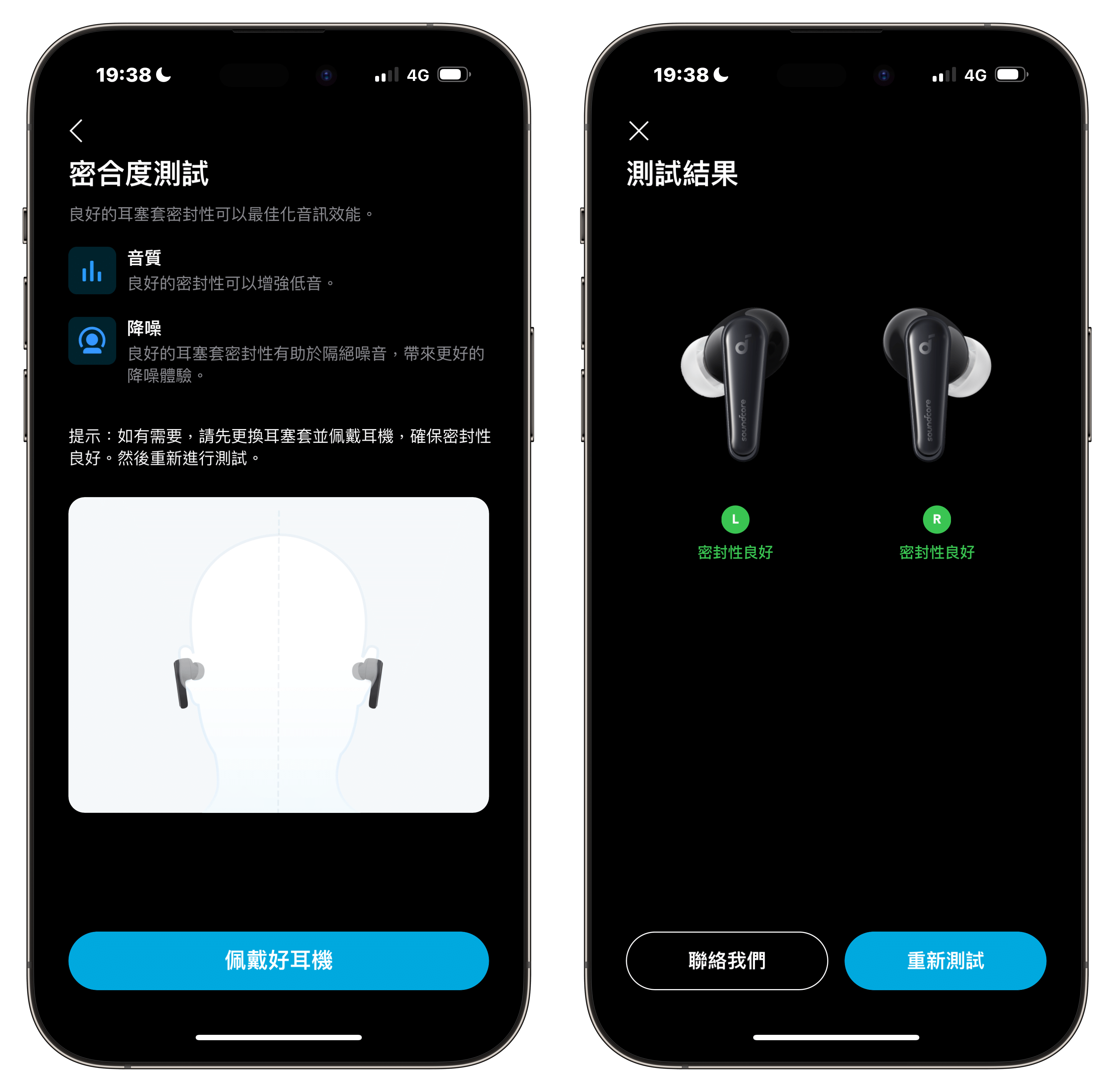 ▲ 如果你不確定當下的耳塞適不適合自己,也可以用「soundcore」應用程式內建的「密合度測試」來測試看看,如果都沒問題的話就會顯示密封性良好。