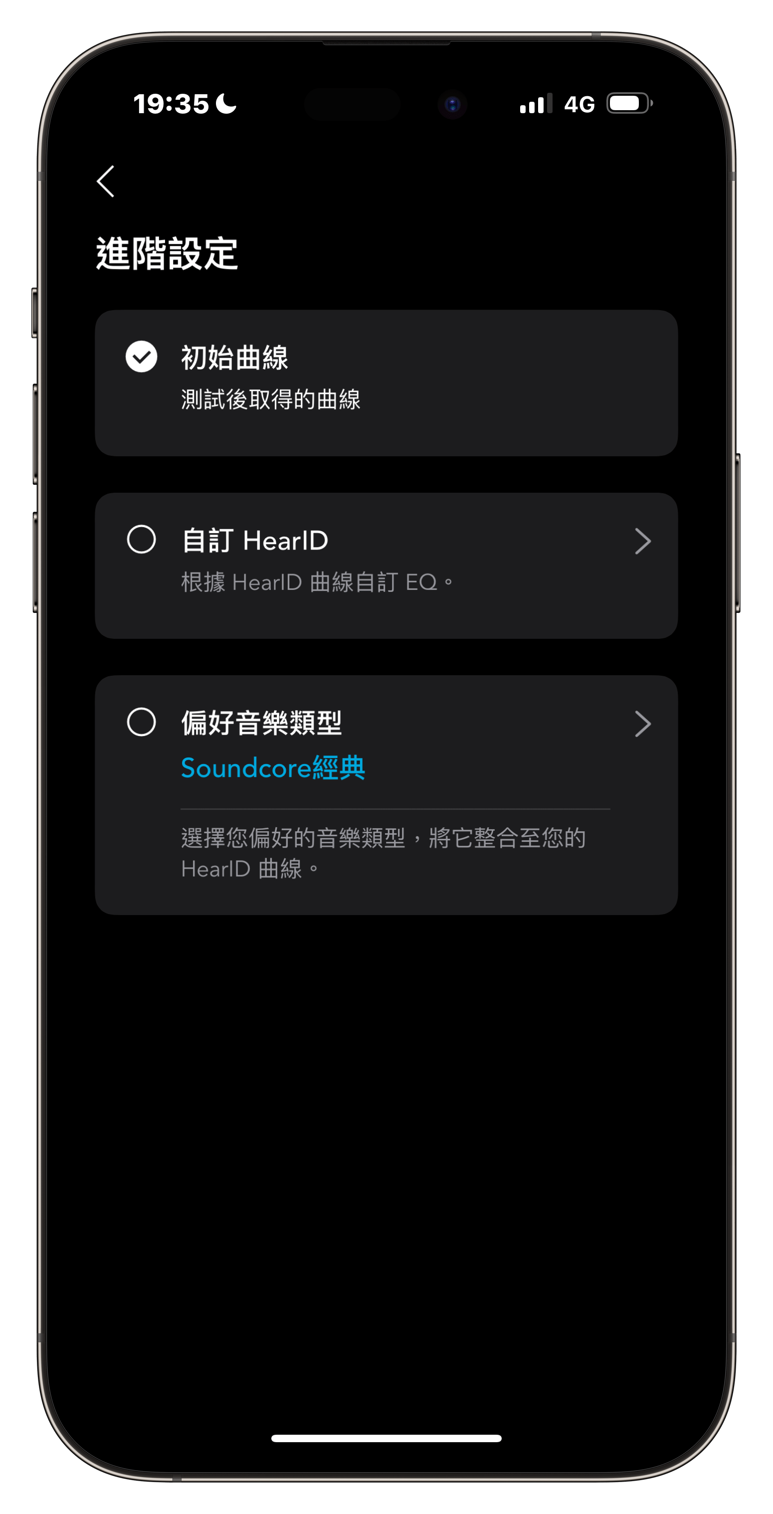 Liberty 4 一樣有「HearID 2.0 聽紋識別」功能,簡單來說,它可以依照你的耳朵聽力跟個人偏好,客製化專屬聲音。值得一提的是,之前的 HearID 都完全以「聽力測試」為依據,但這次還加入了「偏好測試」,表示它現在會同時將你個人的喜好納入考量,提供更「對味」的聲音。雖然不曉得為什麼這次 HearID 沒有帶來很明顯的差異,不過我還是很推薦你試試看,還滿好玩的。