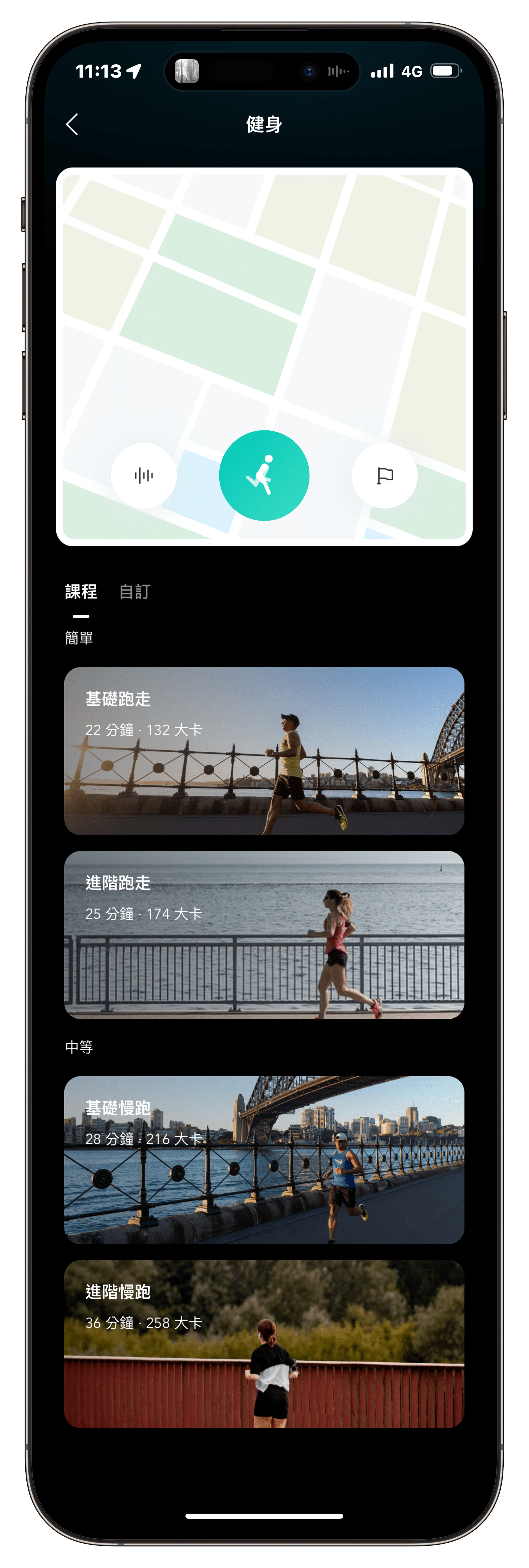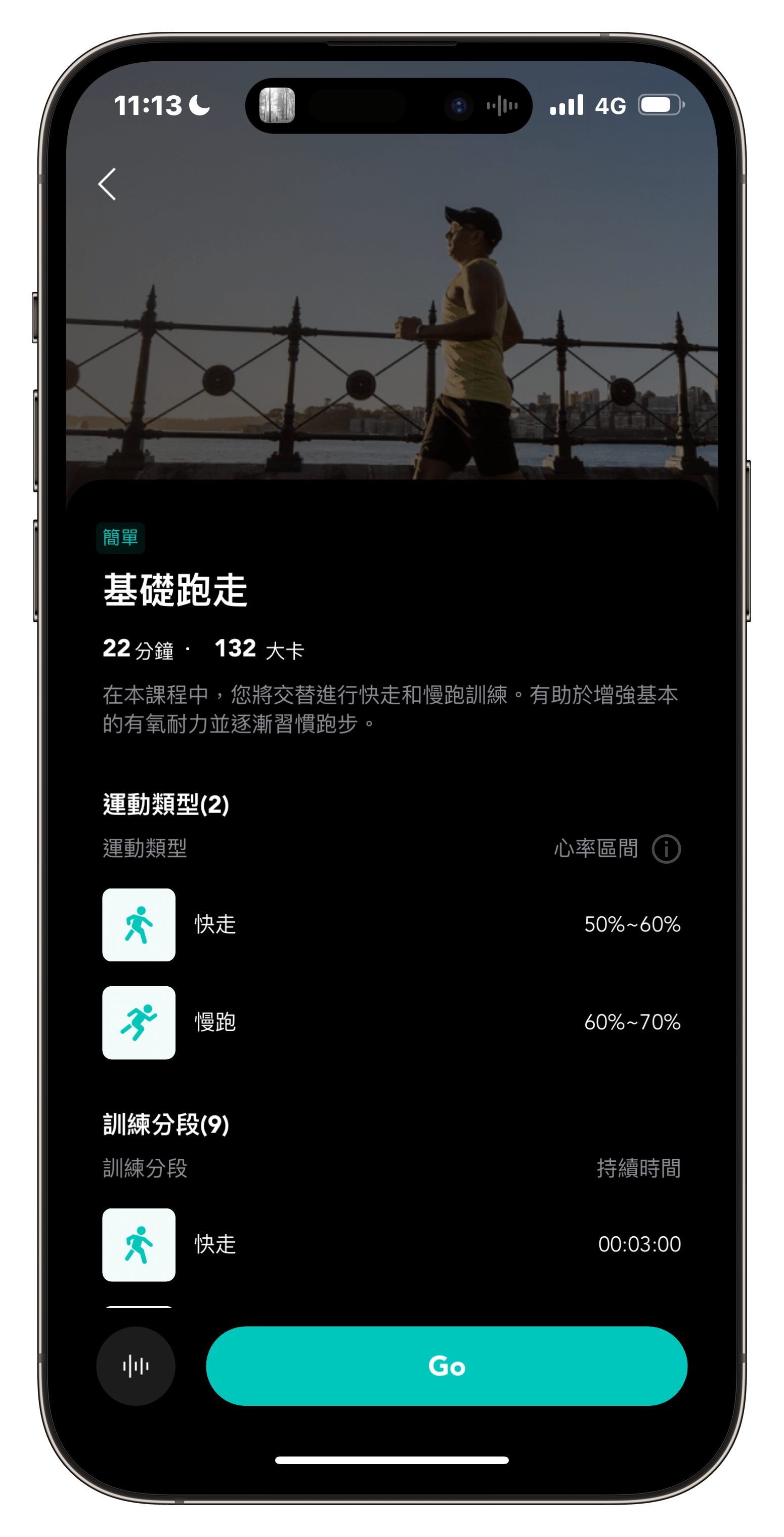 ▲ 隨意點入「基礎跑走」看看,功能還算完善。上面先帶使用者概覽這項鍛煉預計耗時多久、消耗多少卡路里;下方則條列運動類型,以及訓練分段的實際內容。