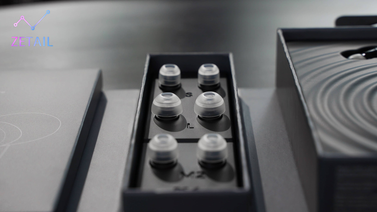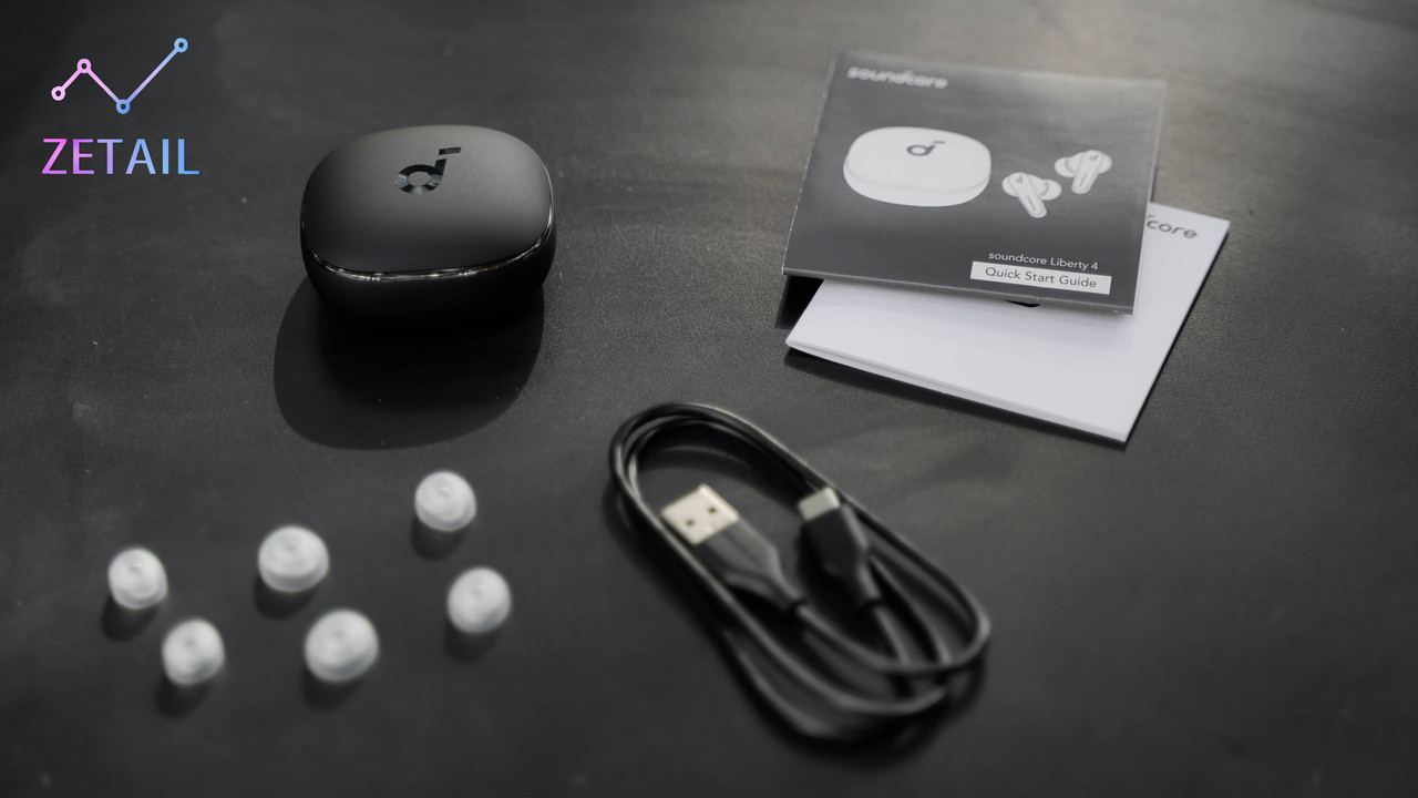 ▲ 盒裝內所有內容物如上圖,包括 Liberty 4、四組不同尺寸的 CloudComfort 矽膠耳塞(其中一組在耳機上)、一條 USB-C 充電線、快速上手指南等紙本文件。