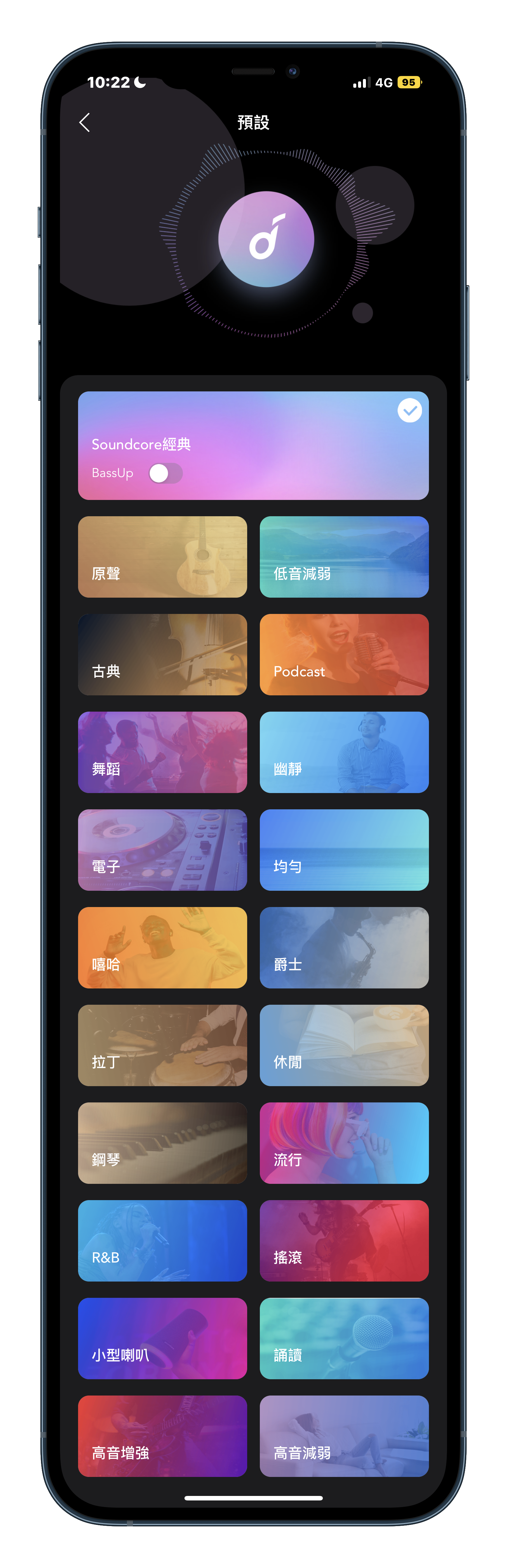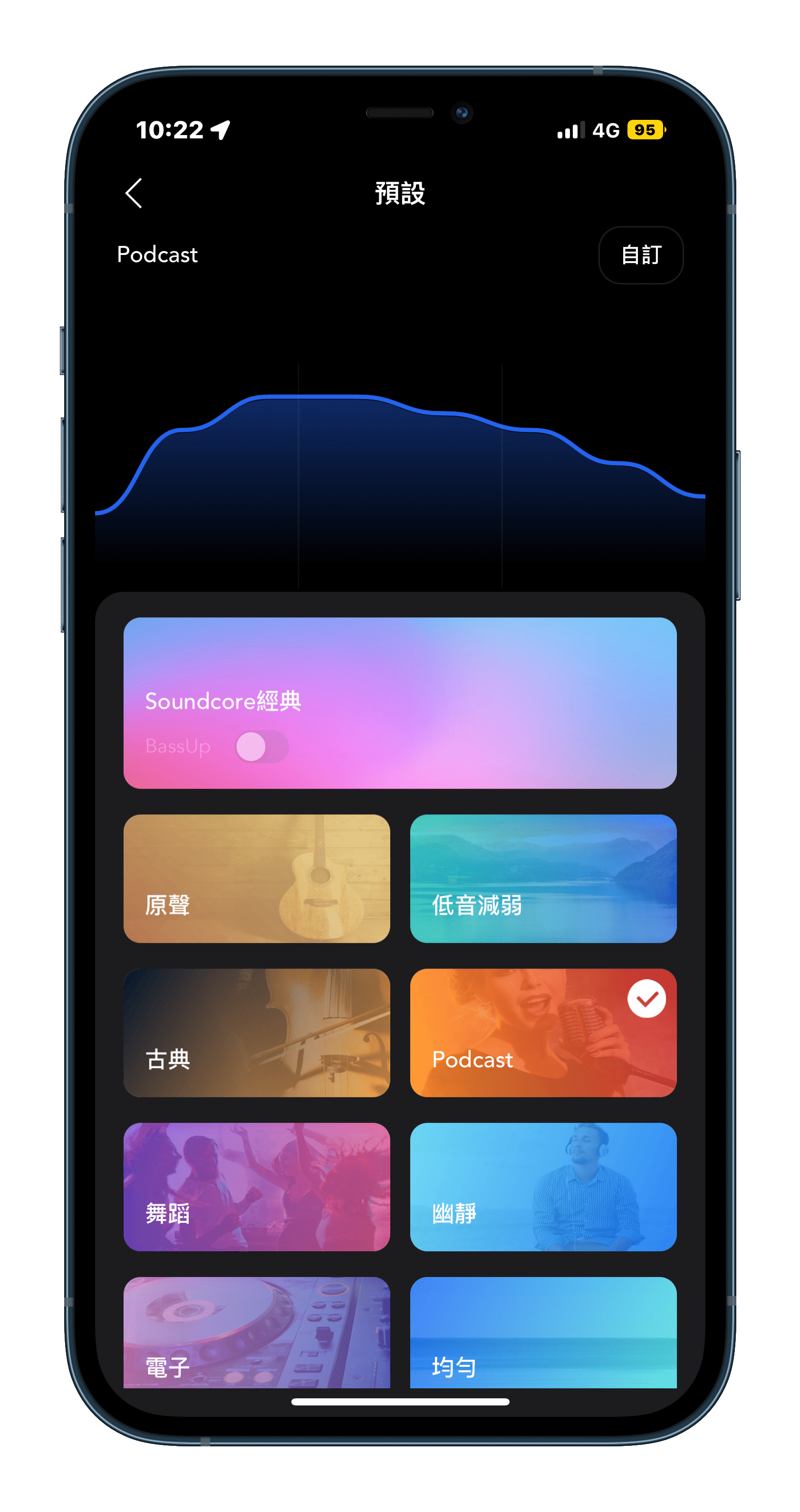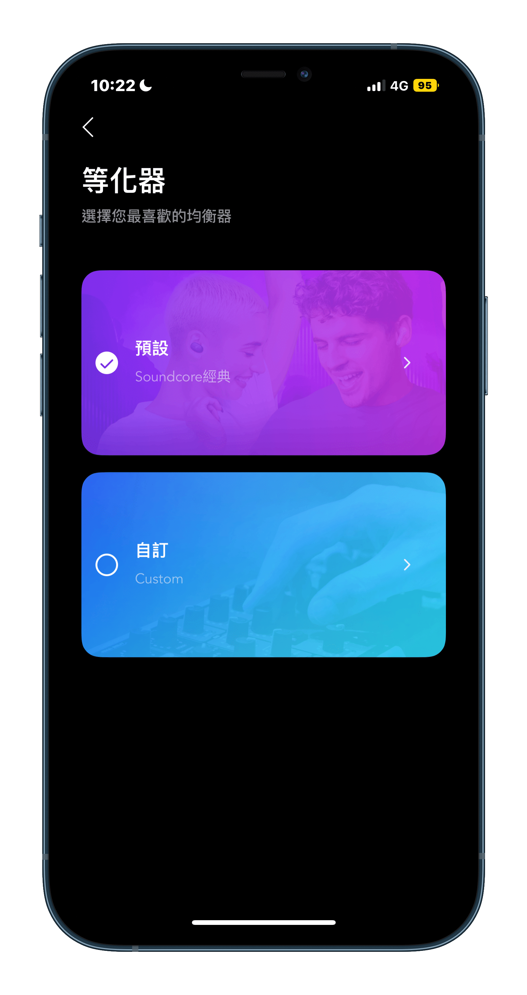 ▲ 在「Soundcore」應用程式點進「等化器」,會有「預設」和「自訂」可以選擇。