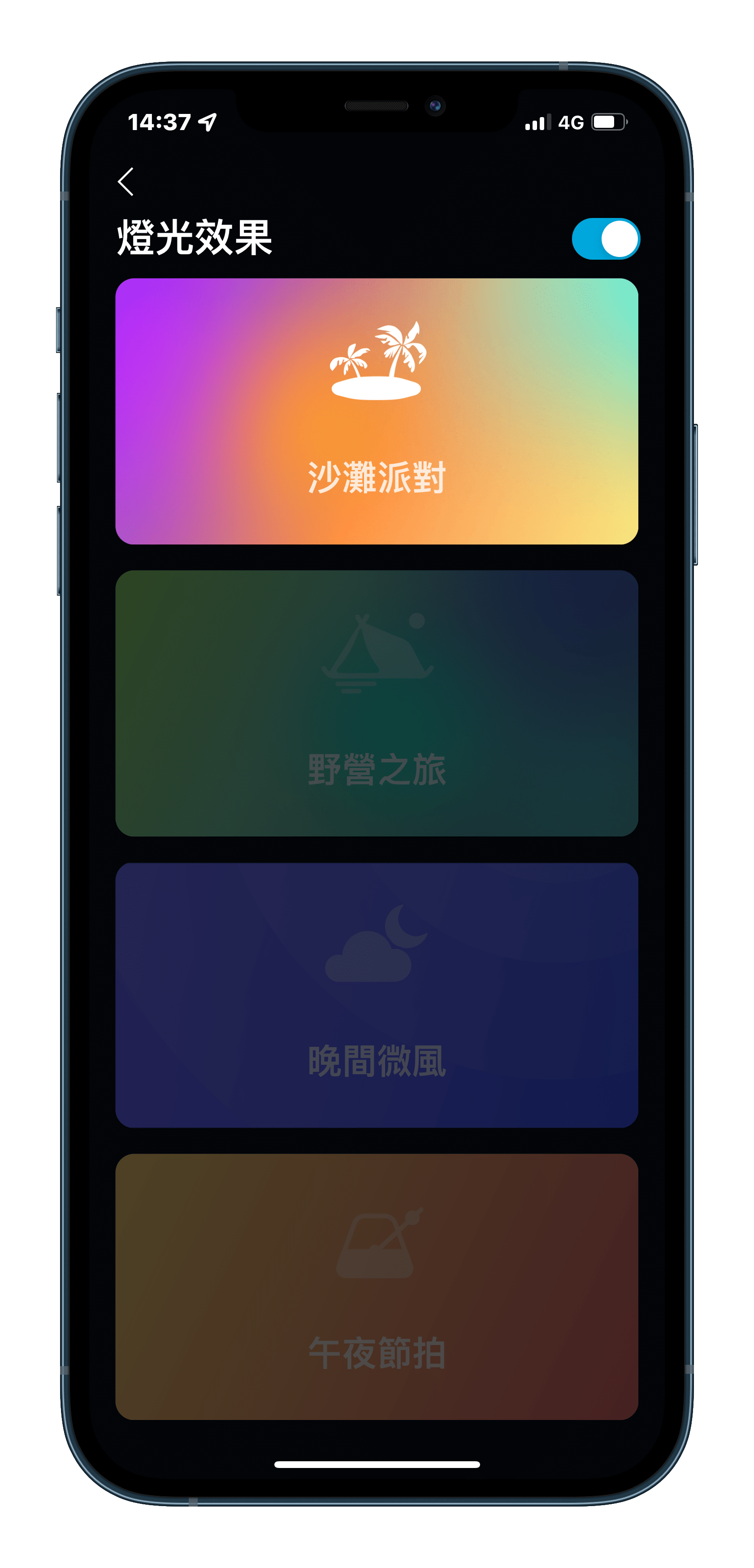 ▲ 目前 Select Pro 總共有四種燈光效果,分別是「沙灘派對」、「野營之旅」、「晚間微風」、「午夜節拍」,至於它們有什麼差別?我覺得前兩者比較動態、有活力;後兩者則是偏向輕柔的感覺。