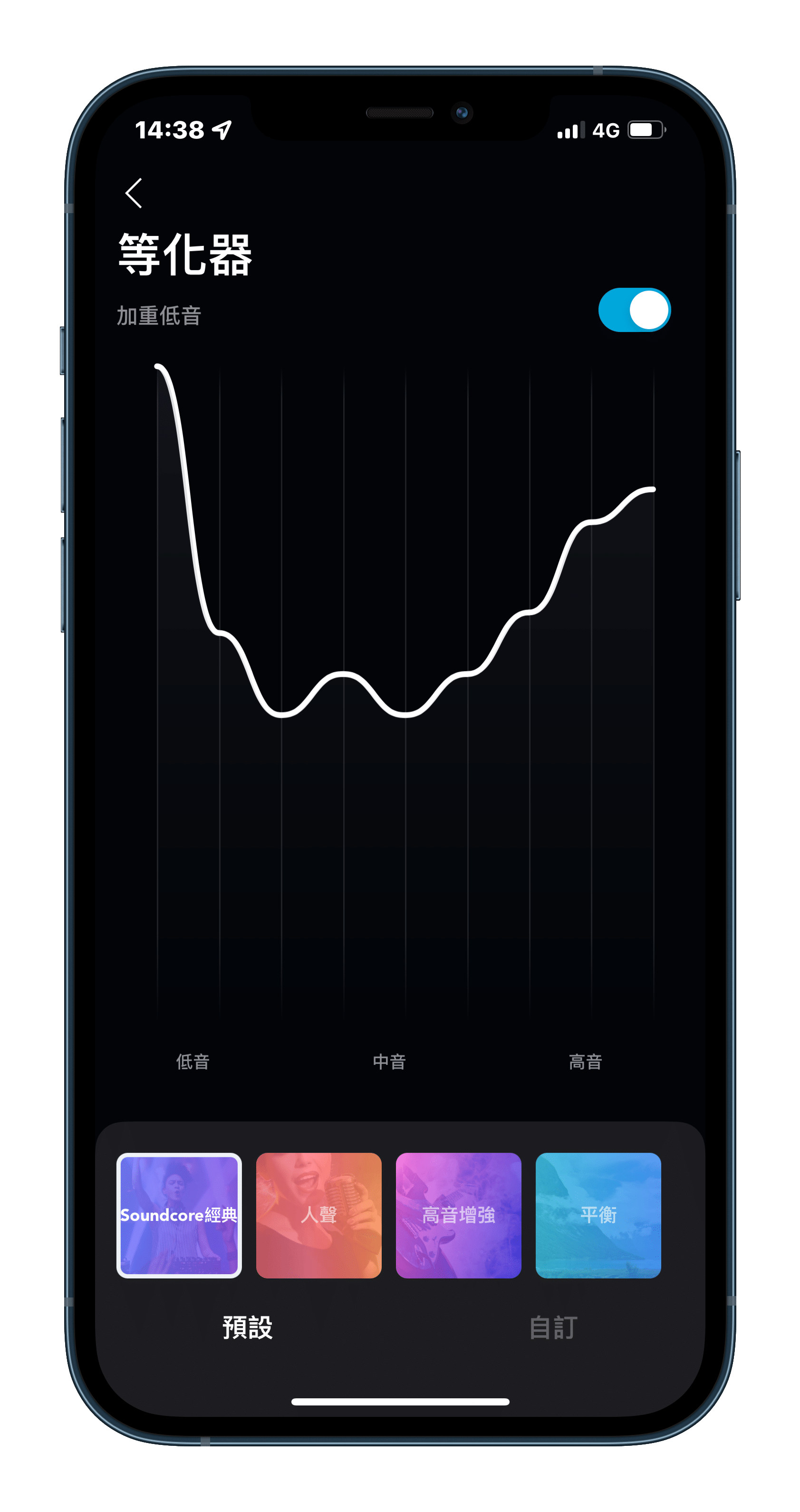 ▲ 「Soundcore」應用程式內建的等化器功能,預設有四種等化器可以選擇,分別是「Soundcore 經典」、「人聲」、「高音增強」、「平衡」,上面也會同時顯示這些等化器的曲線。