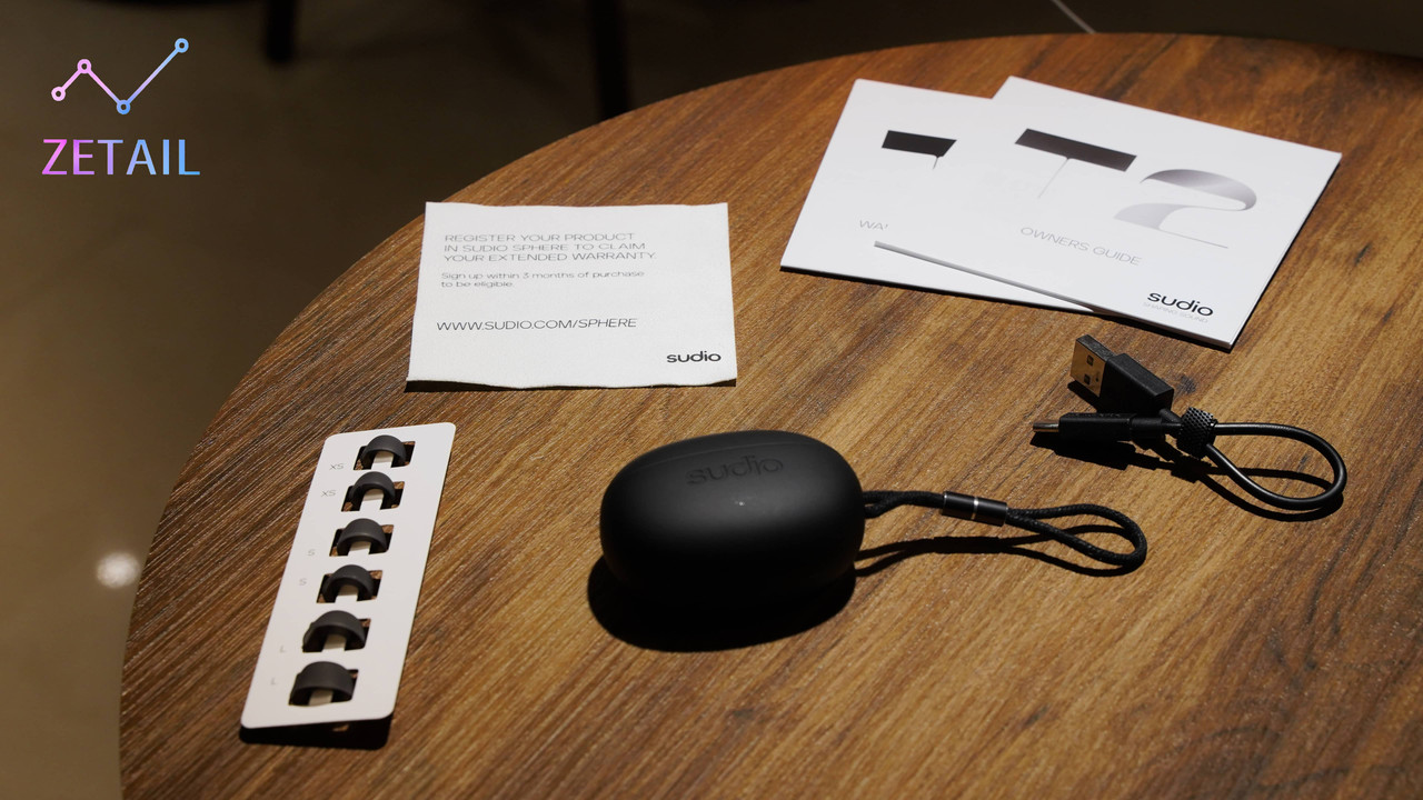 ▲ 盒裝內所有內容物如上圖,包括 Sudio T2、四組不同尺寸的矽膠耳塞(其中一組在耳機上)、一條 USB-C 充電線、說明書,以及一片螢幕擦拭布。