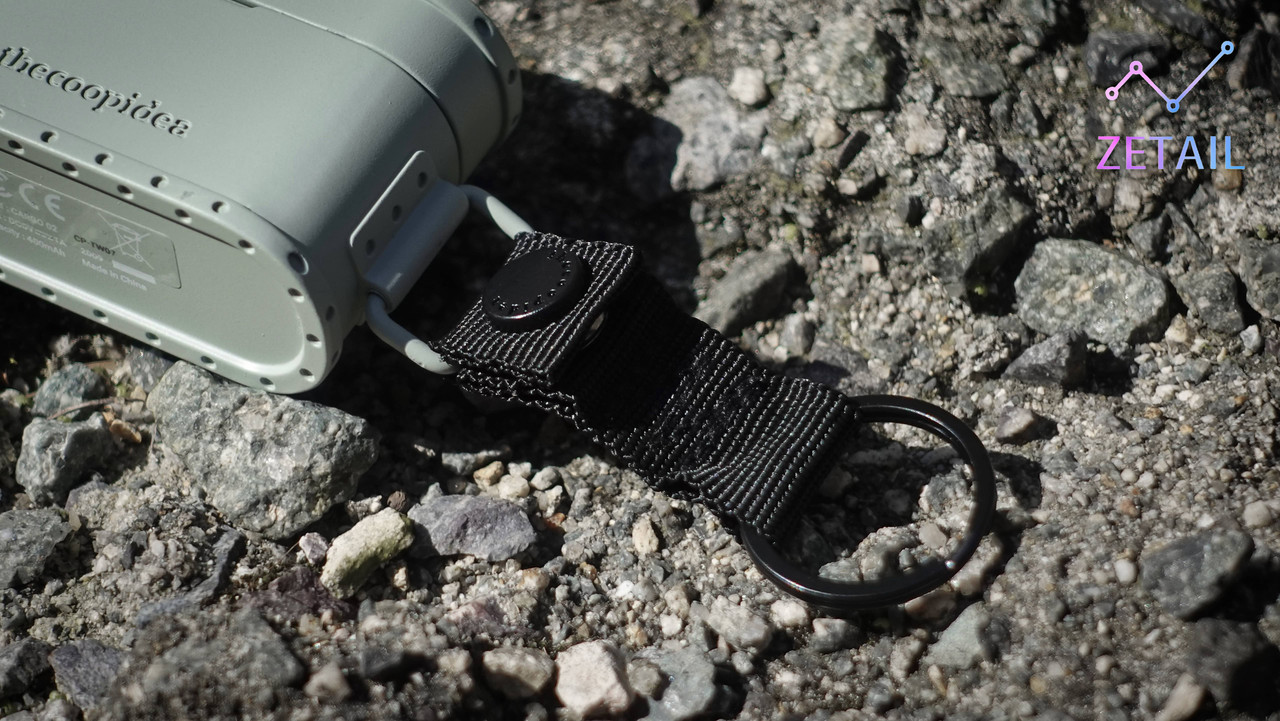 ▲ 充電盒一側有個扣環,可以先把隨附的 D 環吊帶扣上來。