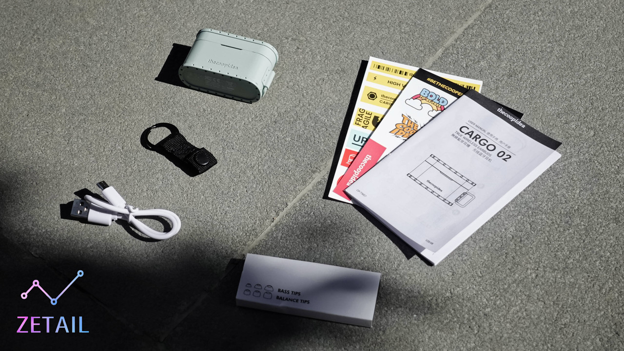 ▲ 盒裝內所有的內容物如上圖,包括 CARGO 02、D 環吊帶、thecoopidea 風格貼紙、使用說明書、一條沒有 Logo 的 USB Type-C 充電線、六種不同款式 / 尺寸的矽膠耳塞。