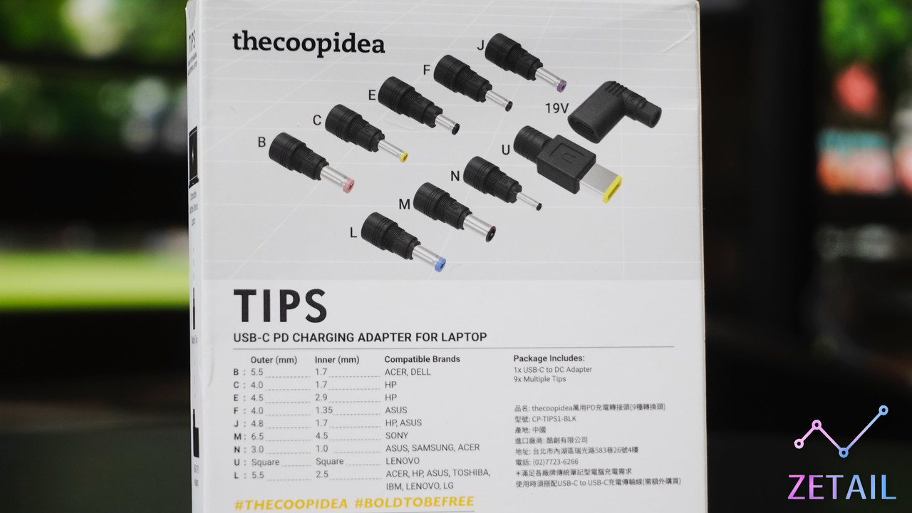 雖然這不是「歡樂旅遊包」的一部分,不過也是近期 thecoopidea 推出的新產品,簡單來說,它的用途就是讓那些 USB Type-C 插槽不支援 Power Delivery (PD) 充電,或甚至根本沒有 USB Type-C 插槽的筆電也能透過 USB Type-C 充電線來充電。顧名思義,它裡面有多達 9 種不同規格的充電轉接頭,可以對應市面上主流品牌所推出的筆電,如:ASUS、Acer、Lenovo、HP、Dell…等等。