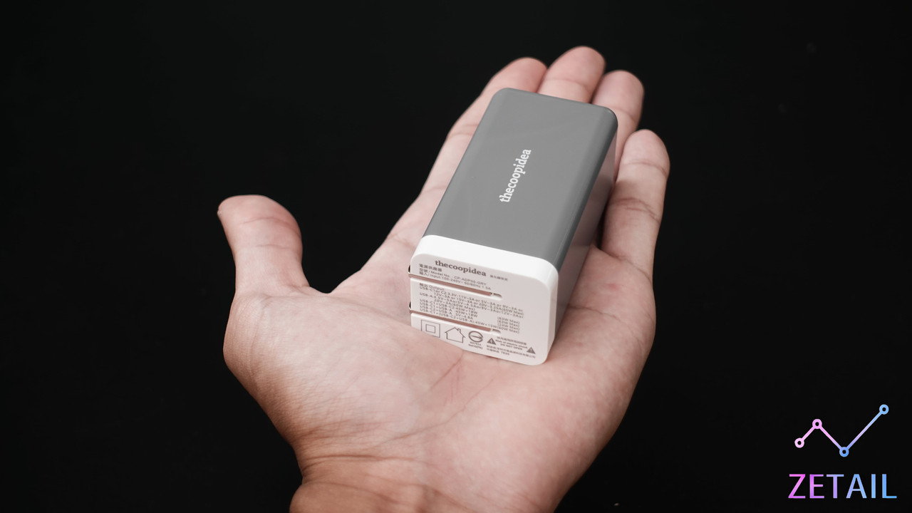 得益於搭載「GaN 氮化鎵」材料,MINI BLOCK S 才得以在保證輸出功率夠大的前提下,同時將充電器體積縮小到只有 MacBook Pro (13 吋) 原裝充電器 (61W) 的一半左右,再加上可以一次替三款裝置充電,無疑是外出旅行時,極佳的選擇。MINI BLOCK S 的外觀設計很樸素,除了 thecoopidea 的 Logo 外就沒有其它裝飾,個人覺得有點單調,而且看起來不置中的 Logo 讓我很難受,但是幸好這些都不影響 MINI BLOCK S 作為一個出色的充電器。