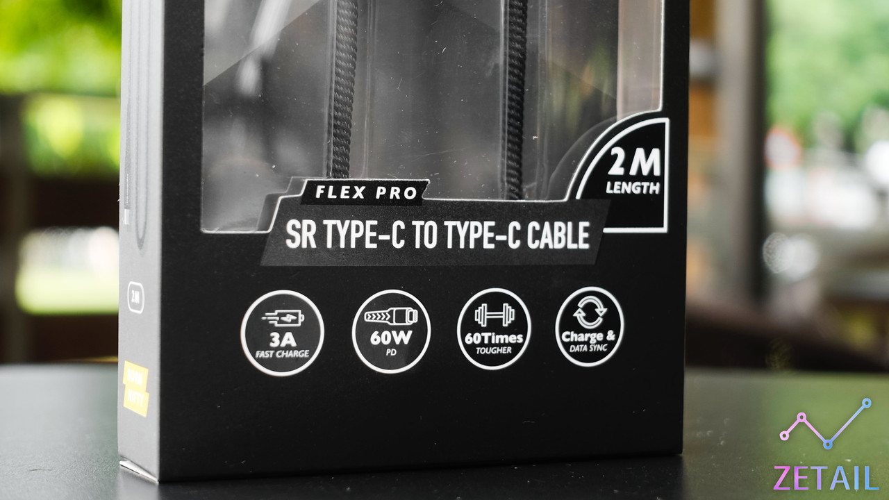 ▲ 下方寫著 Flex Pro 的幾項特色,比如最大可以承受 3A 的電流、支援 60W 快充…等。另外,我開箱的這條是 2 公尺版本。