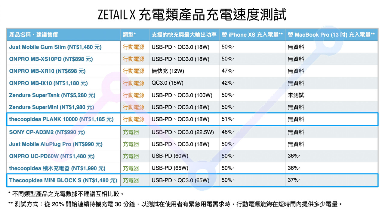 ▲ 從上圖可以看到 MINI BLOCK S、PLANK 跟其它競品的充電測試結果,兩者的表現都很優異。(資料來自 ZETAIL X)