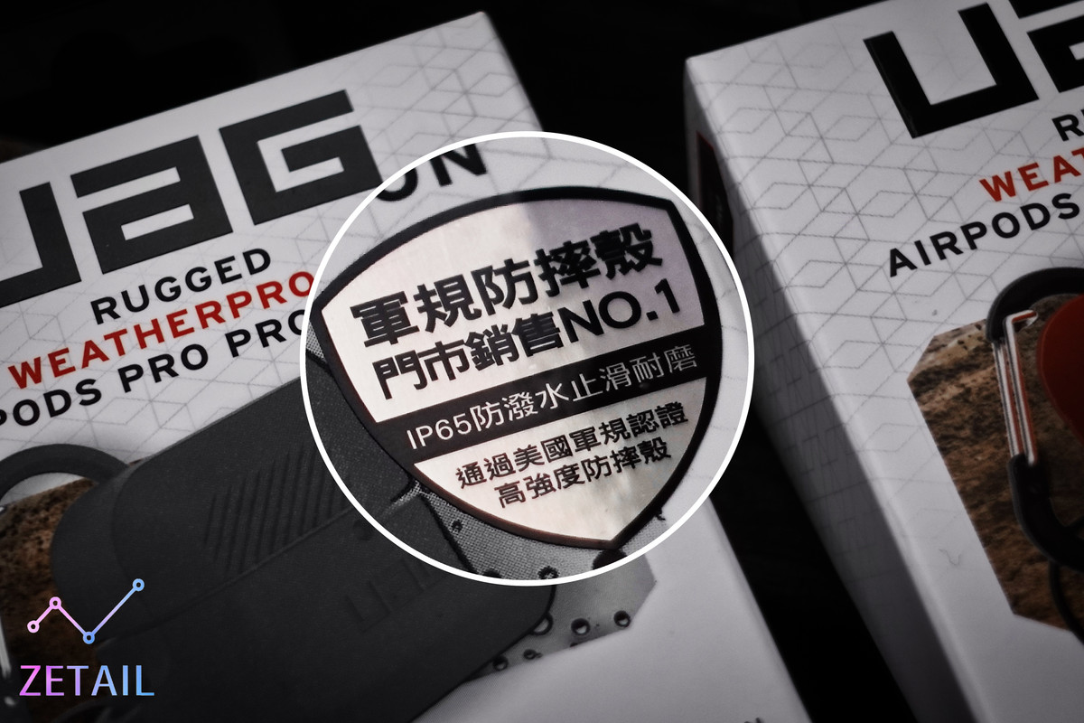 ▲ 盒裝側面標示著「MIL-STD 810G」,表示 UAG 的 AirPods Pro 保護殼通過了美國軍規防摔認證。