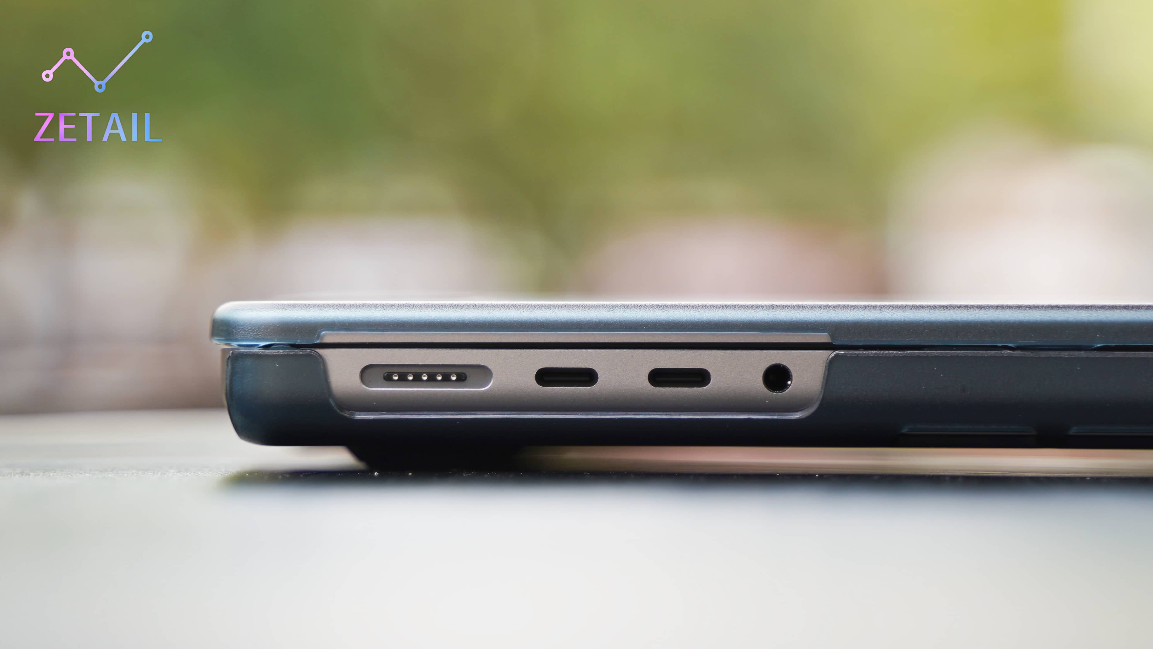 除了保護、外型,在體驗方面,UAG [U] Dot 保護殼則盡可能保留裸機時的使用體驗,它的開孔很精準,MacBook Pro 本來的插槽都能正常使用,包括 MagSafe 3 磁吸充電、SDXC 記憶卡、HDMI 插槽等,以及用於幫助筆電散熱的氣流通風孔。至於底部,UAG 也有在四個角落加上防滑橡膠軟墊,讓筆電放在平面可以保持靜止。