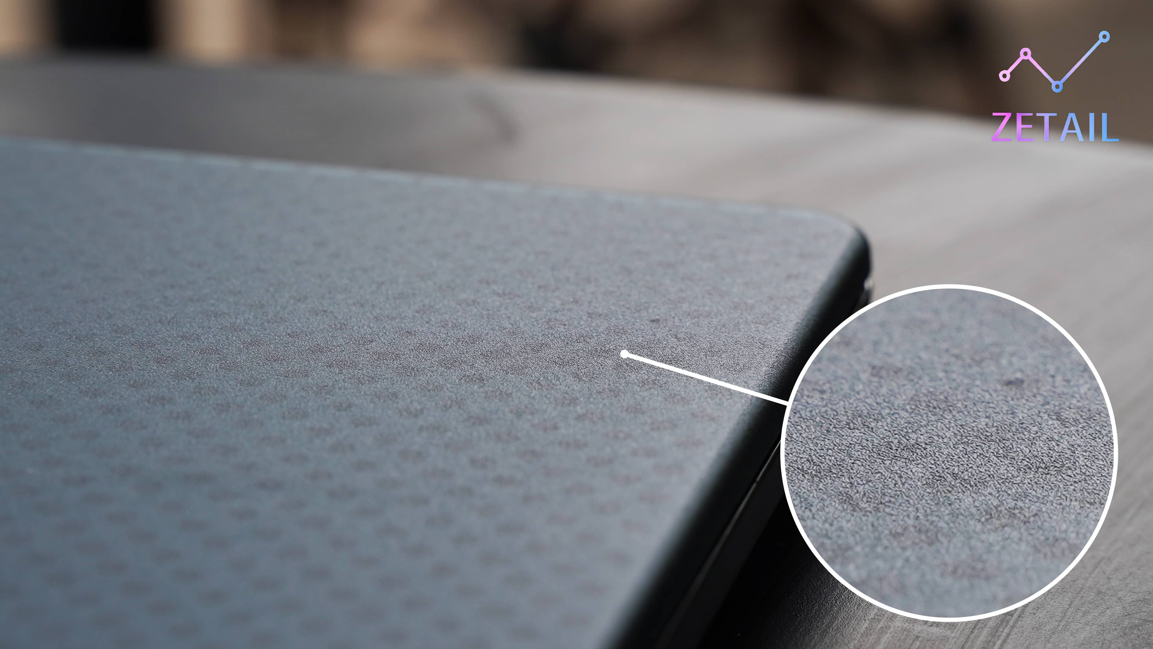 UAG [U] Dot 筆電保護殼的外殼採用磨砂霧面質感,比較粗糙、顆粒感明顯,摸起來跟一般光滑亮面的保護殼很不一樣;我自己很喜歡這個觸感,因為它完全杜絕了沾指紋的問題,基本上也不太會留下使用痕跡,防刮效果優異。