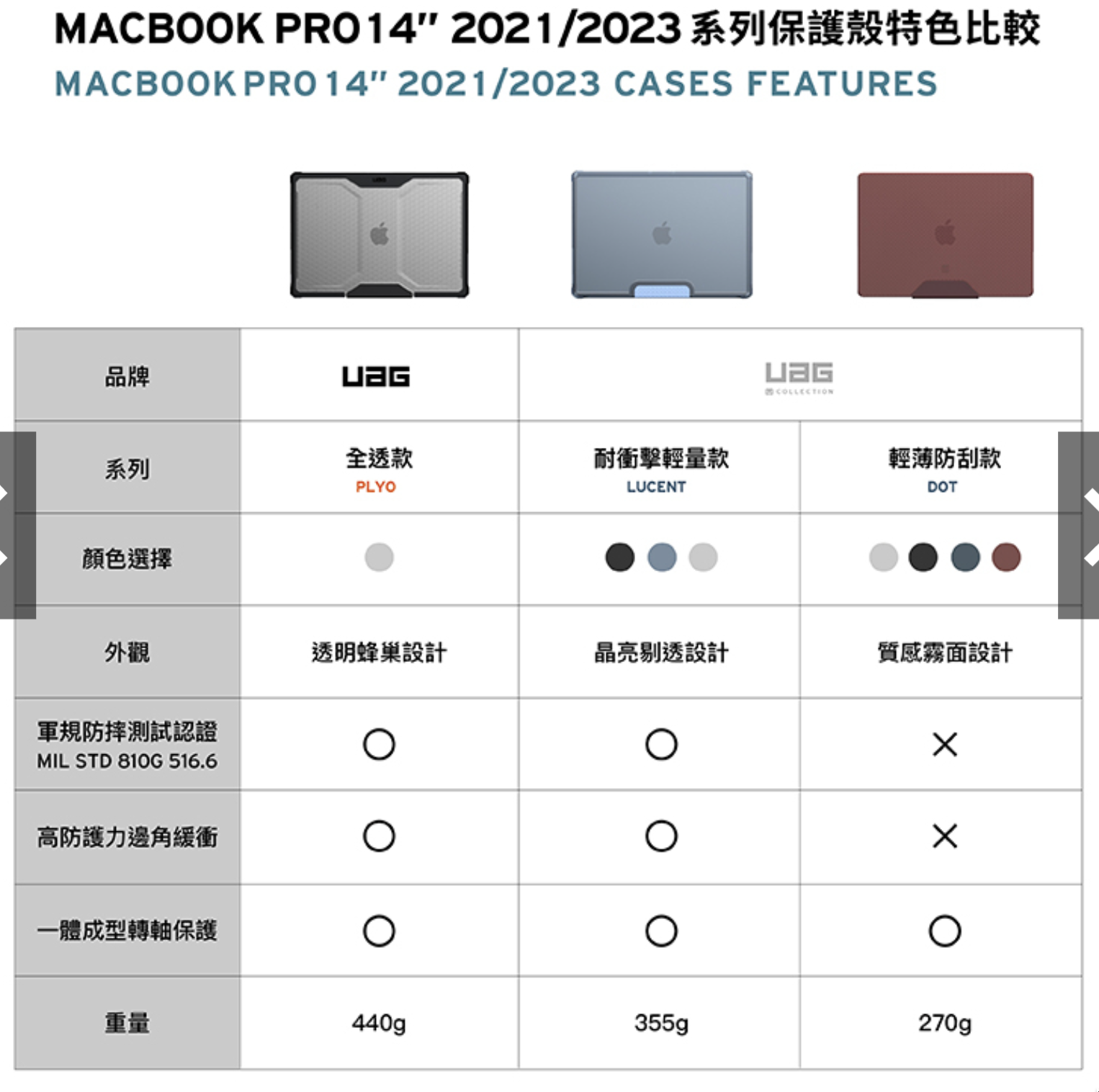目前 UAG 的 MacBook Pro 保護殼共有三個系列,分別是 PLYO 全透款、Lucent 耐衝擊輕量款,以及 Dot 防刮款。前二者具備耐衝擊能力,並達到 MIL-STD 810G 美國軍規防摔標準,不過也比較厚重(PLYO:440 公克、Lucent:355 公克);我今天開箱的 Dot 則是當中最輕、最薄的,僅 270 公克,但就沒有耐衝擊設計,防護性著重在「防刮」。