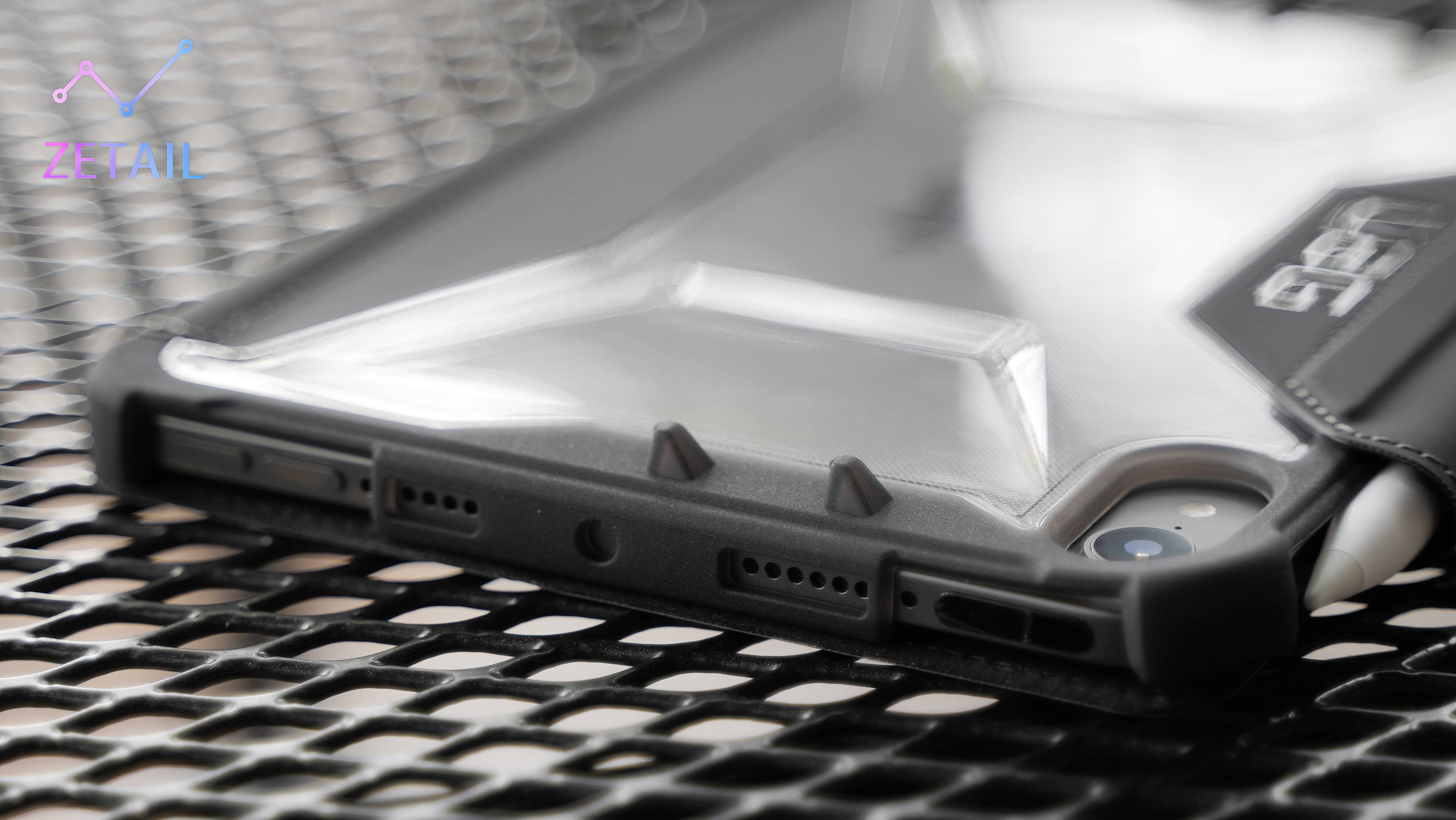 如果你喜歡極簡、低調的保護殼,那 PLYO 全透款應該會是這四款保護殼中最適合你的一款。它的正面除了 UAG 的 Logo,沒有額外的裝飾、圖樣,可以說是完全的素面,觸感很滑順、舒適,初步看起來也挺耐刮跟耐用的。背面顧名思義是透明的,看得到 iPad 的機身,不過在這邊 UAG 就用了一些點陣設計,讓它的觸感、觀感有一些變化。
