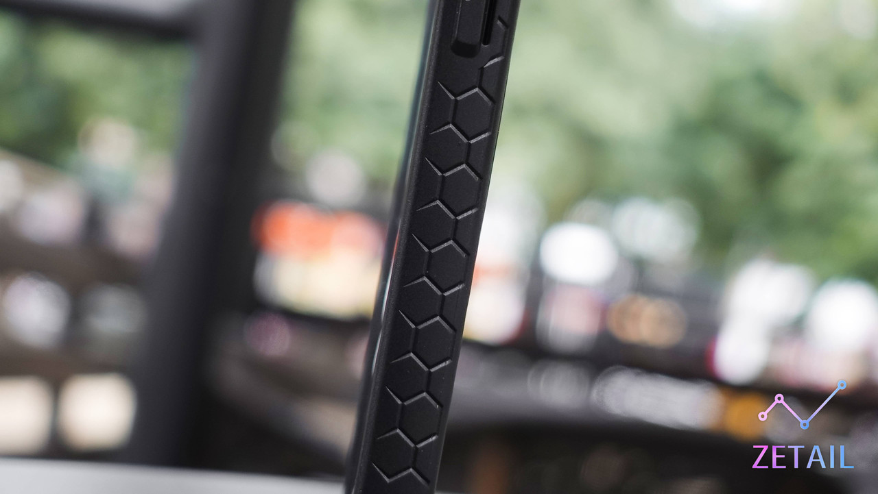 ▲ 在保護殼的耐衝擊橡膠邊框上有「蜂巢紋路」,對握持穩定性頗有幫助。
